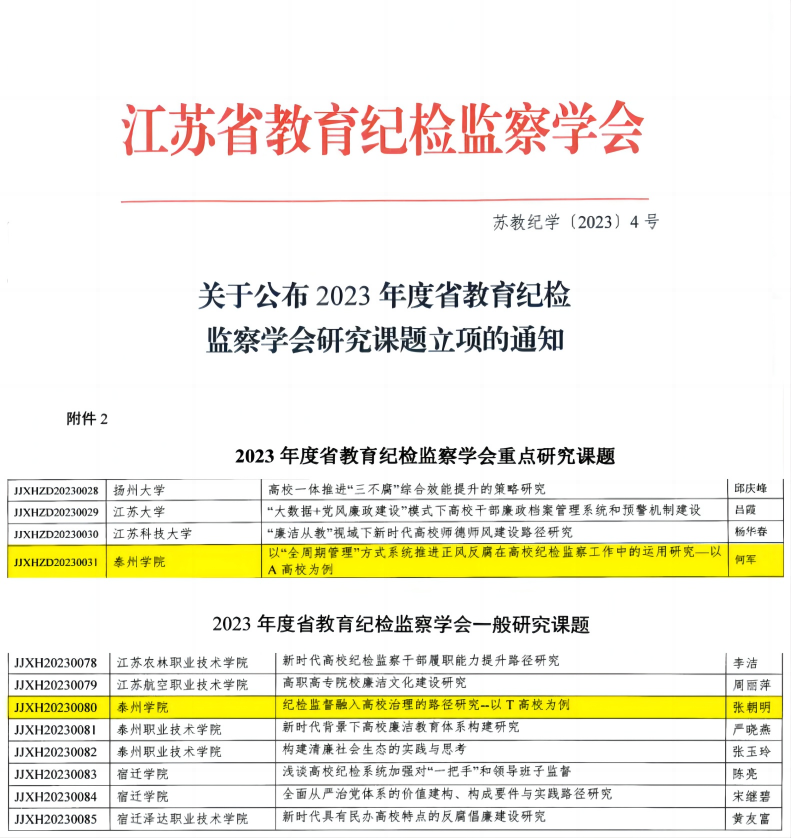 近日,江苏省教育纪检监察学会公布2023年度研究课题立项名单,米兰官网获批2项研究课题。其中,何军《以“全周期管理”方式系统推进正风反腐在高校纪检监察工作中的运用研究——以A高校为例》获批重点研究课题,张朝明《纪检监督融入高校治理的路径研究——以T高校为例》获批一般研究课题。
