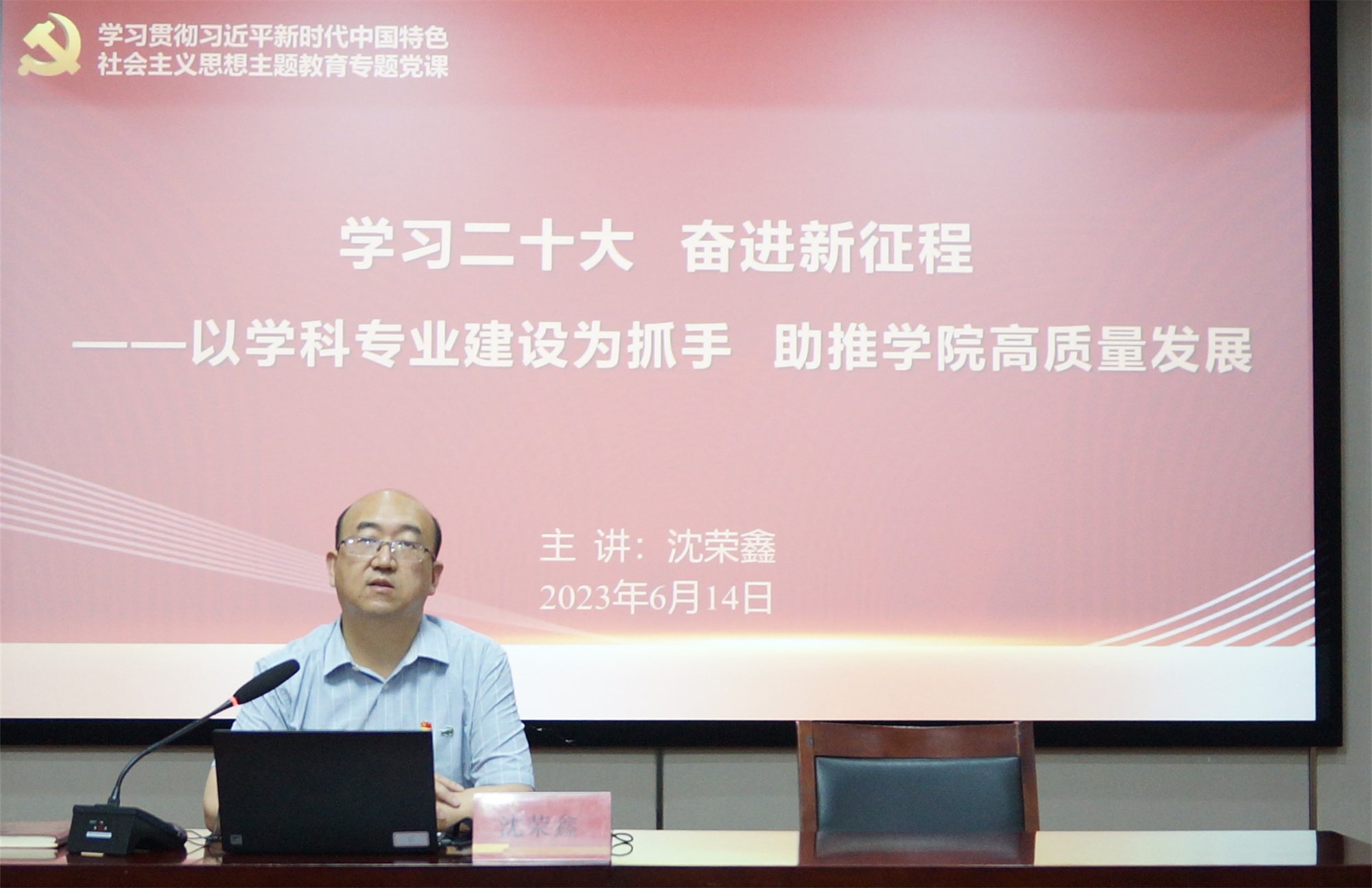 为扎实推动学习贯彻习近平新时代中国特色社会主义思想主题教育入脑入心、见行见效,6月14日下午,校党委常委、副校长沈荣鑫以“学习二十大 奋进新征程 ——以学科专业建设为抓手 助推学院高质量发展”为题讲授专题党课,机电工程学院、教育教学评估中心、后勤处、国有资产管理处相关人员及学生党员代表参加学习。