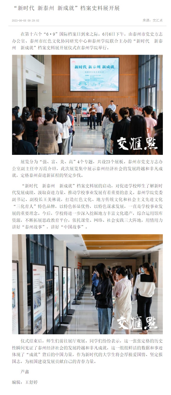 《交汇点新闻》6月8日报道由泰州市党史方志办公室、泰州市红色文化协同研究中心和LETOU国际米兰官网联合主办的“新时代 新泰州 新成就”档案史料展开展仪式在米兰官网举行。报道题为:《“新时代 新泰州 新成就”档案史料展开展》,链接为:https://jnews.xhby.net/v3/waparticles/40b0f14a6b4f49a794c7efad90ce3c3c/0/rLXSXWoVVsXJffRD/1