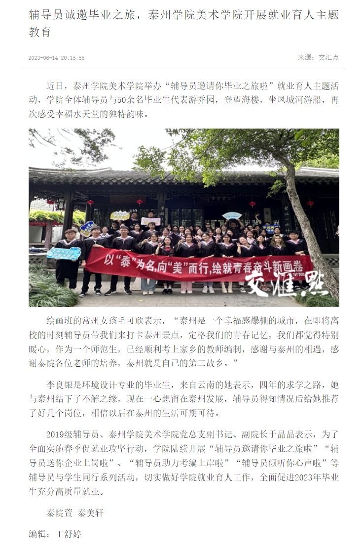 《交汇点新闻》6月14日报道美术学院举办“辅导员邀请你毕业之旅啦”就业育人主题活动,学院全体辅导员与50余名毕业生代表游乔园,登望海楼,坐凤城河游船,再次感受幸福水天堂的独特韵味。报道题为:《辅导员诚邀毕业之旅,LETOU国际米兰官网美术学院开展就业育人主题教育》,链接:https://jnews.xhby.net/v3/waparticles/40b0f14a6b4f49a794c7efad90ce3c3c/0/cbSfbjql2XJzya1X/1