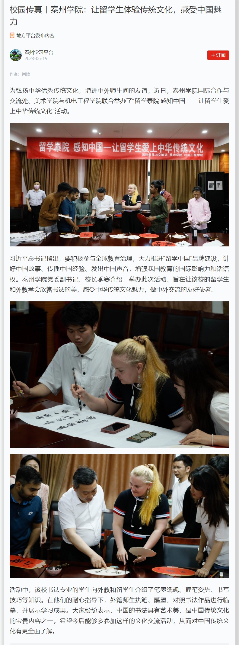 《学习强国》6月15日报道米兰官网举办“留学泰院·感知中国——让留学生爱上中华传统文化”活动,报道题为《校园传真丨LETOU国际米兰官网:让留学生体验传统文化,感受中国魅力》。链接为:https://article.xuexi.cn/articles/index.html?art_id=9710659474991502064&item_id=9710659474991502064&cdn=https%3A%2F%2Fregion-jiangsu-resource&study_style_id=feeds_opaque&pid=&ptype=-1&source=share&share_to=wx_single