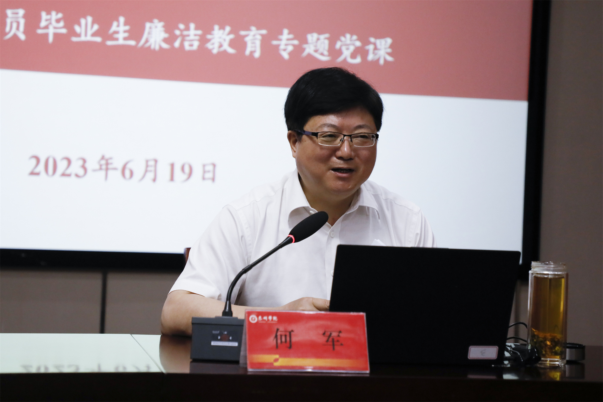 为引导毕业生党员永葆廉洁初心,筑牢崇廉尚洁的思想根基,帮助毕业生党员扣好职业生涯的“第一粒扣子”。6月19日上午,校党委常委、纪委书记何军应邀为2023届毕业生党员讲授廉洁教育专题党课,相关职能部门代表、二级学院学工书记、2023届毕业生党员代表等50余人参加学习。