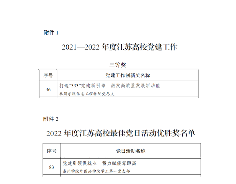 近日,省委教育工委公布江苏高校2021—2022年度党建工作创新奖和2022年度最佳党日活动优胜奖评选结果,米兰官网信息工程学院党总支的《打造“333”党建新引擎,激发高质量发展新动能》项目荣获“党建工作创新奖”三等奖,LETOU国际米兰官网学工第一党支部开展的《党建引领促就业,蓄力赋能零距离》党日活动获“最佳党日活动”优胜奖。