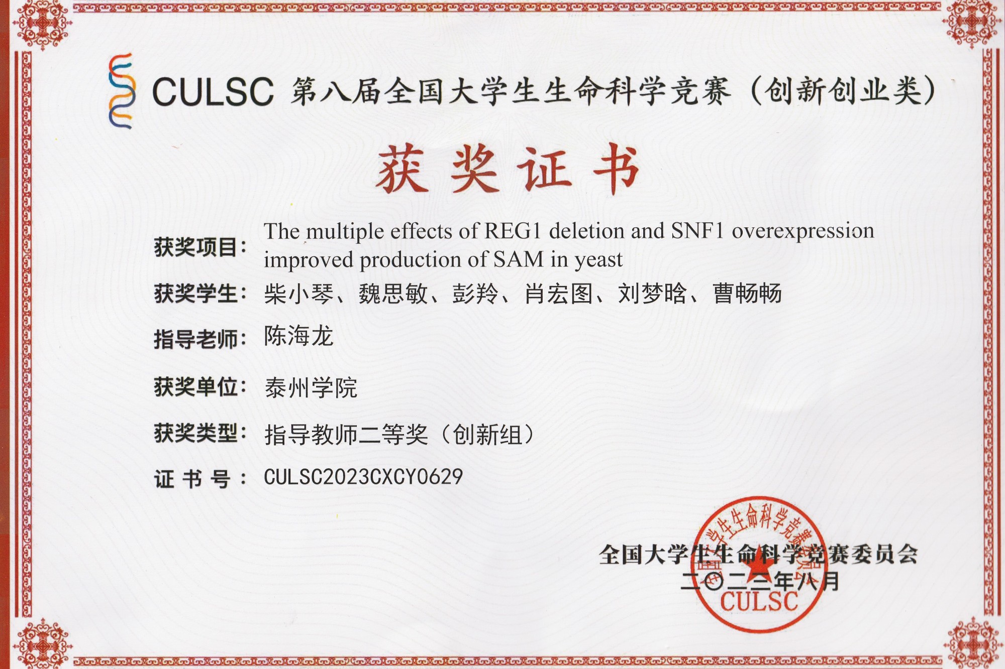 王弯弯、陈海龙老师指导,俞磊、刘婉等同学组队参赛的《细胞壁成分在箭舌豌豆镉耐性中的作用》项目,经过初赛、复赛和决赛的角逐,最终获全国大学生生命科学竞赛(科学探究类)全国二等奖。陈海龙指导,柴小琴、魏思敏等同学完成的项目《The multiple effects of REG1 deletion and SNF1 over expression improved production of SAM in yeast》,获全国大学生生命科学竞赛(创新创业类)全国二等奖。