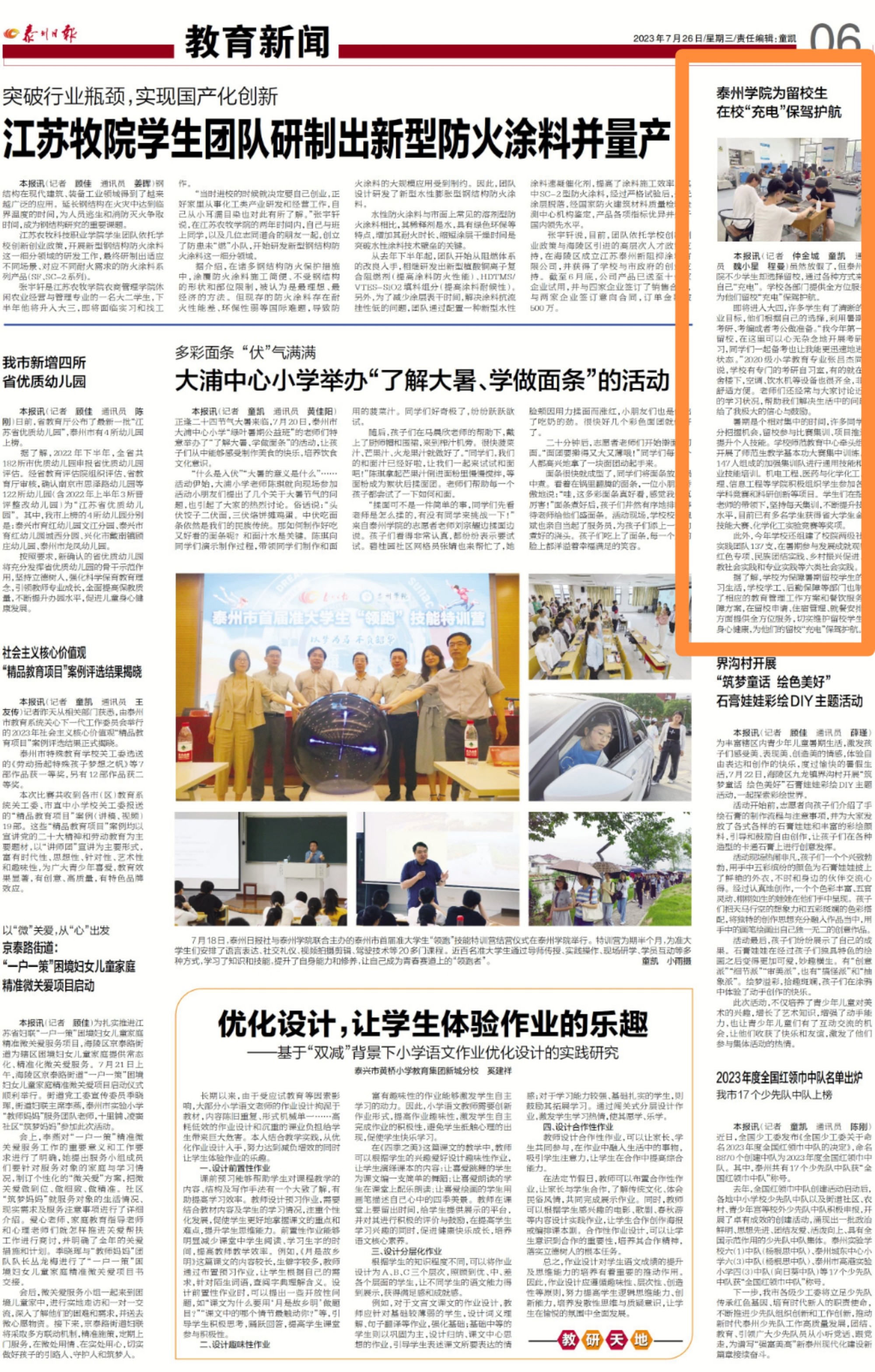 《泰州日报》2023年7月26日第A06版教育新闻,以《LETOU国际米兰官网为留校生在校“充电”保驾护航》为题,报道学校各部门为留校学生提供全方位服务,为他们留校“充电”保驾护航。
