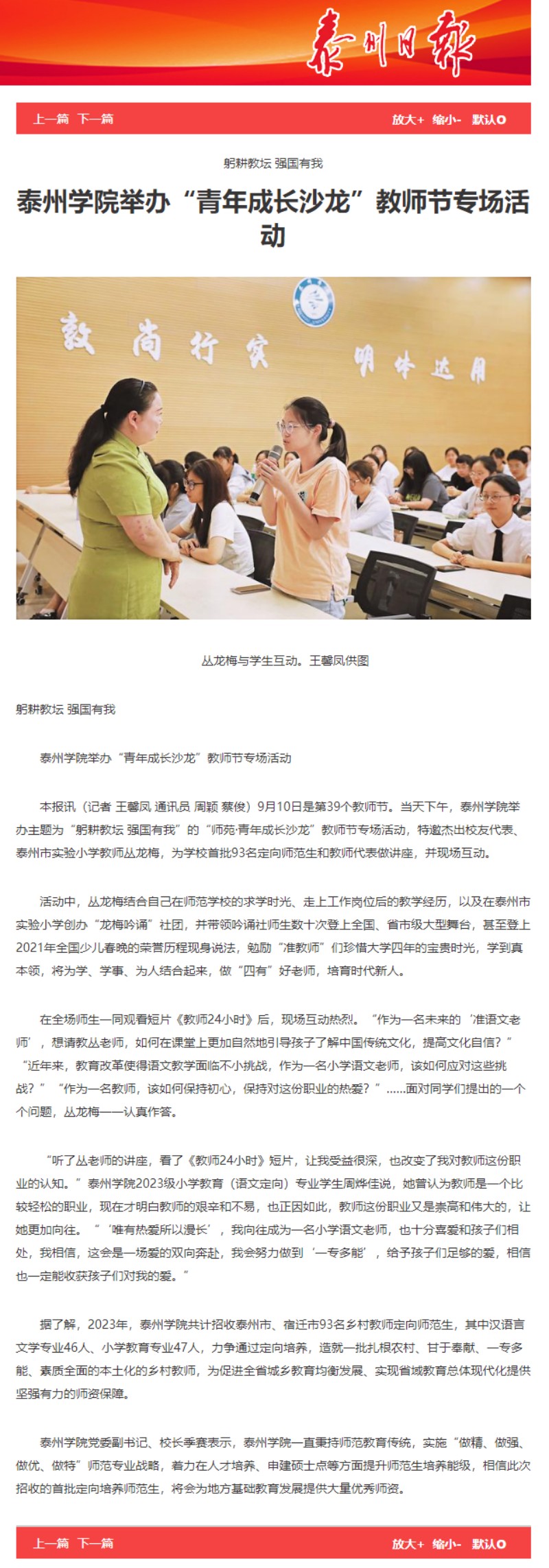 2023年9月13日,《中央广电总台国际在线》《泰州日报》《泰州晚报》多平台报道米兰官网教师节专场活动,题为《LETOU国际米兰官网举办“青年成长沙龙”教师节专场活动》,链接: