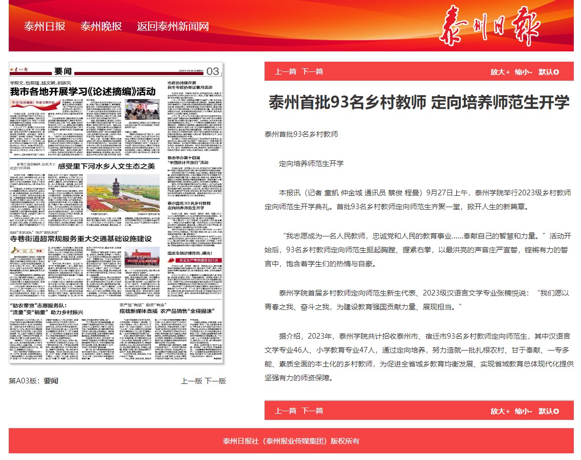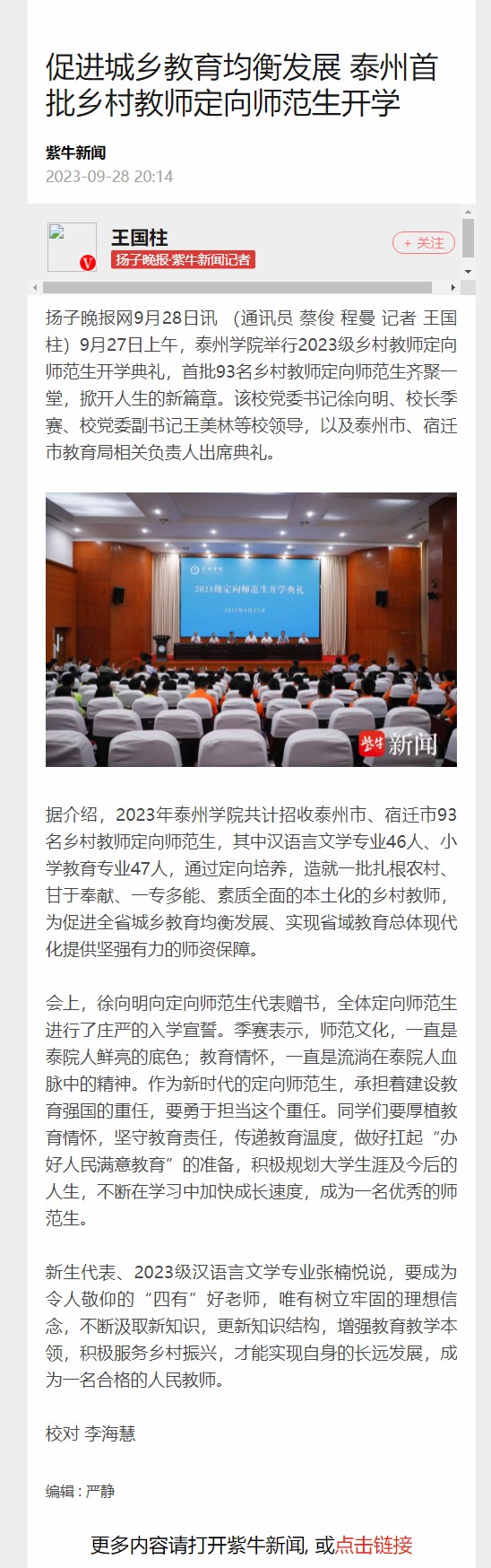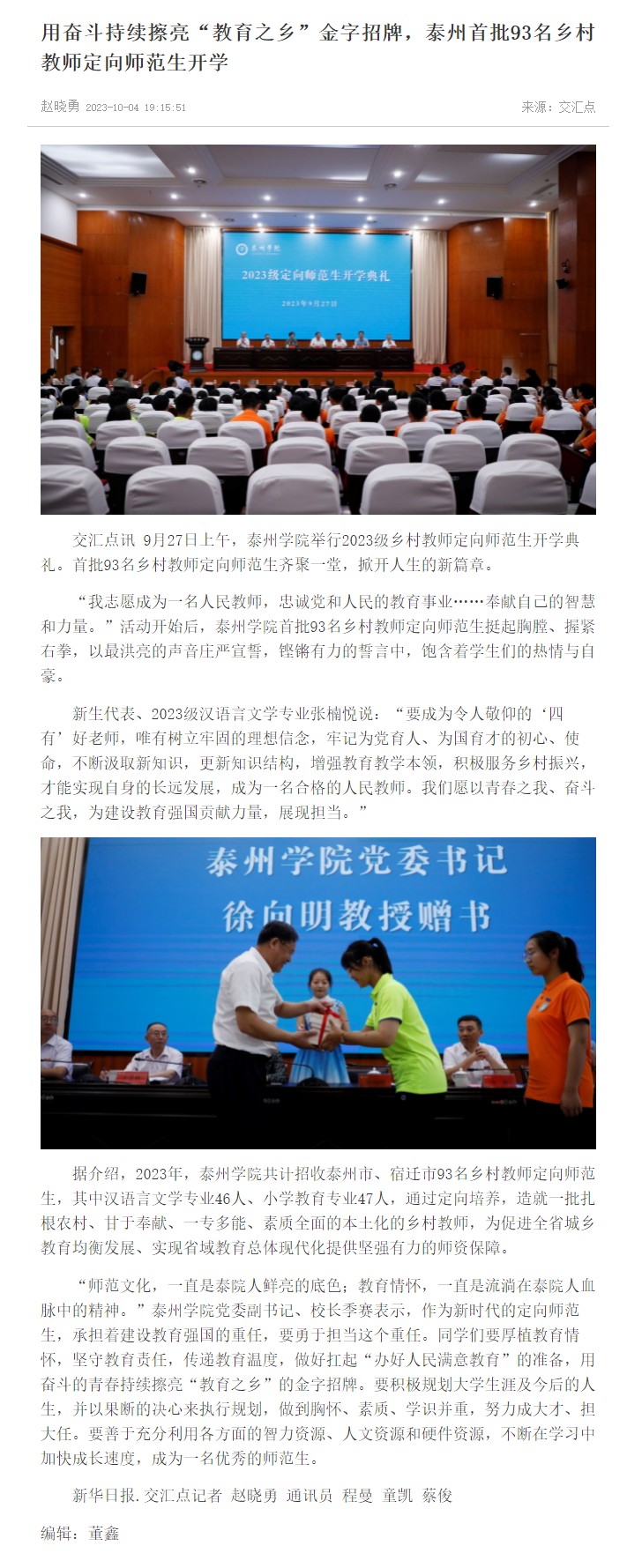 9月28日《泰州日报》《紫牛新闻》,10月4日《交汇点新闻》报道米兰官网首批乡村教师定向师范生开学工作,报道链接:
