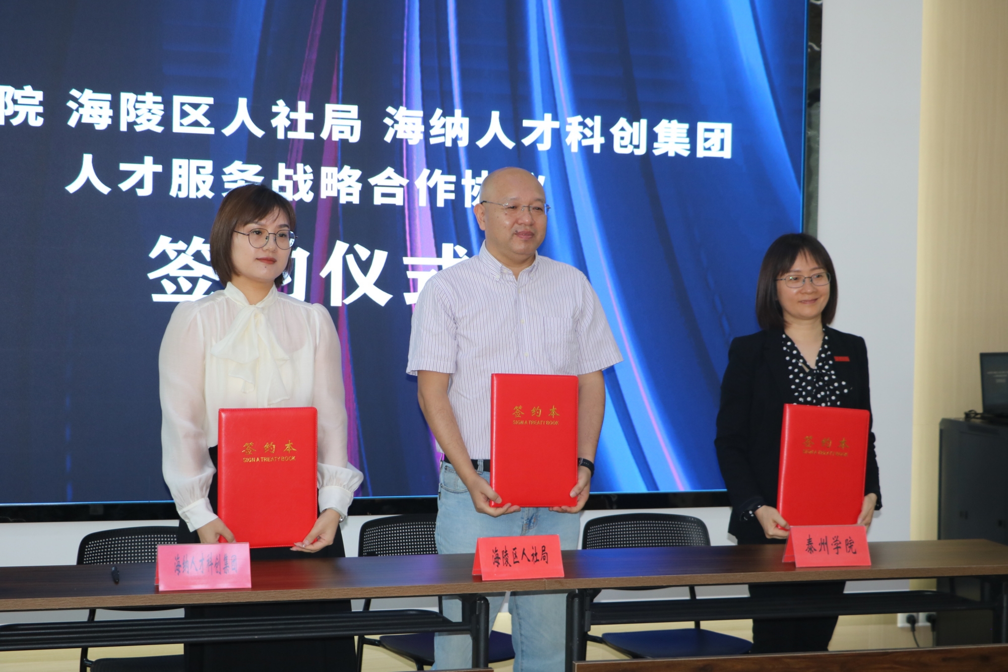 卜慧芬代表学校与海陵区人社局、海纳人才科创集团共同签署了人才服务战略合作协议。