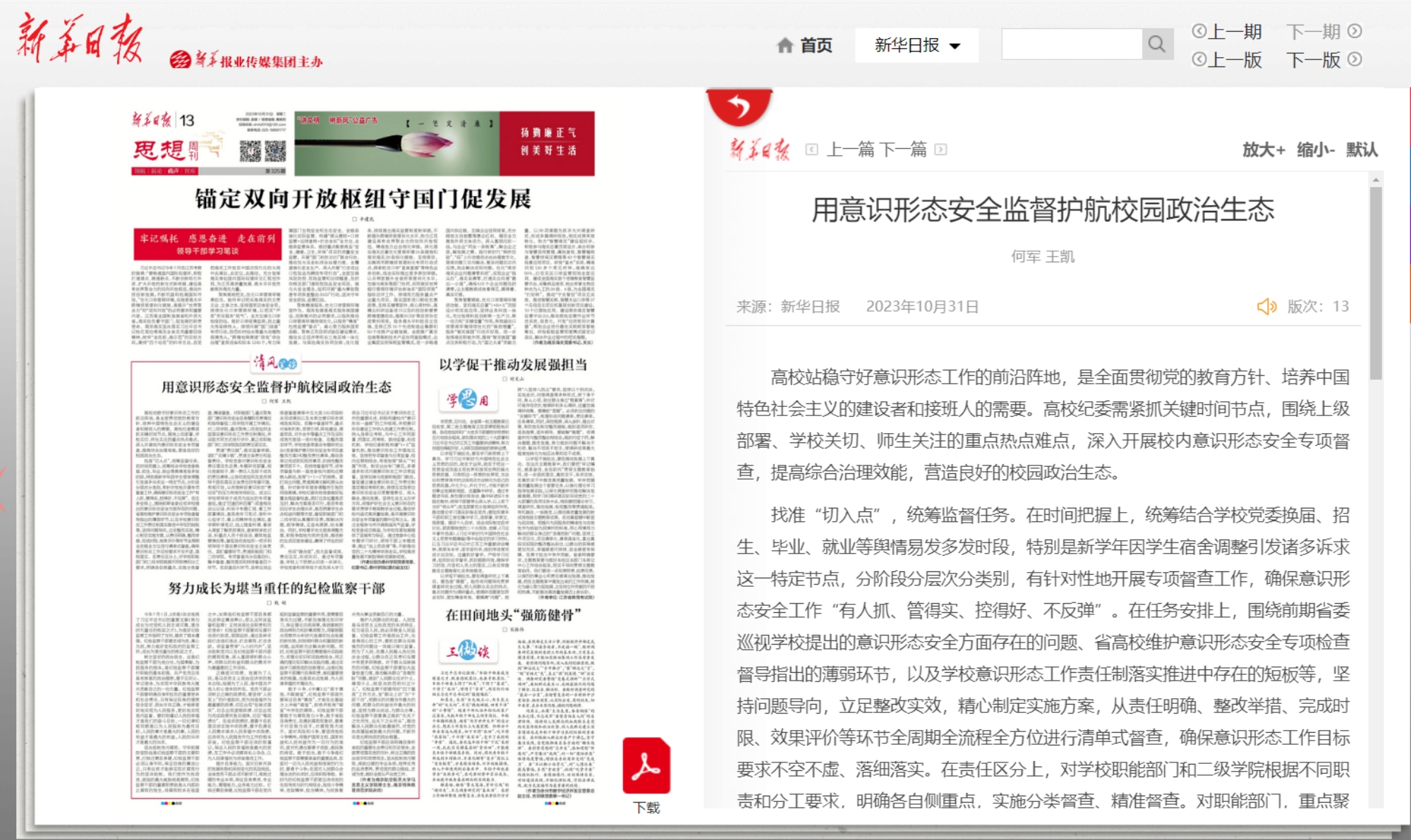 10月31日,《新华日报》第13版思想周刊报道米兰官网党委常委、纪委书记何军等人署名文章《用意识形态安全监督护航校园政治生态》。报道链接:http://xh.xhby.net/pc/layout/202310/31/node_13.html#content_1257179