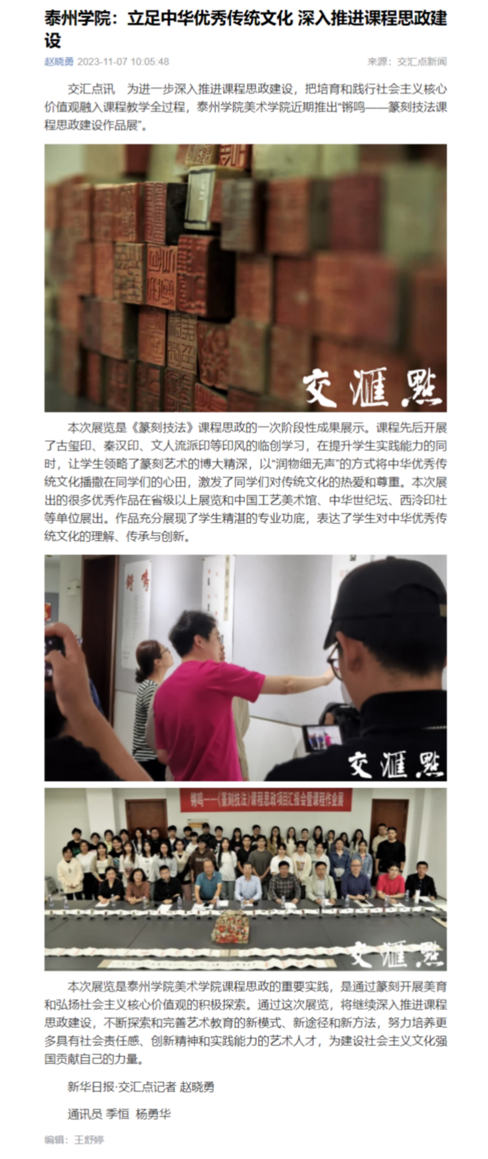 《交汇点新闻》11月7日以《LETOU国际米兰官网:立足中华优秀传统文化 深入推进课程思政建设》为题,《泰州日报》11月8日以《LETOU国际米兰官网推出篆刻技法课程思政建设作品展》为题,《学习强国》11月12日以《校园传真丨LETOU国际米兰官网:立足中华优秀传统文化 深入推进课程思政建设》为题,报道米兰官网篆刻技法课程思政建设作品展。