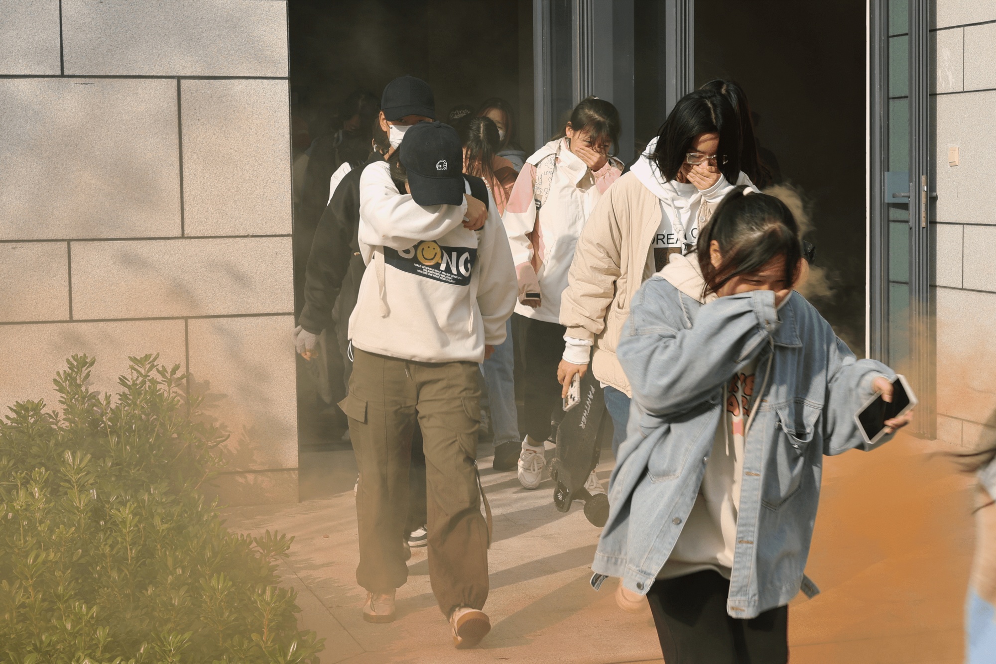 下午2点30分,保卫处处长陈根怀宣布演练开始。教学楼楼梯口冒起滚滚浓烟,伴随着楼内的消防广播疏散信号的响起,同学们弯腰躬行、手捂口鼻,沿着既定路线有序向应急避险区疏散撤离。教学楼过道、楼梯口都有引导员实施引导,保证学生全部安全撤离。短时间内,参演学生全部安全撤离至指定区域。整个演练过程紧凑有序,达到了预期效果。
