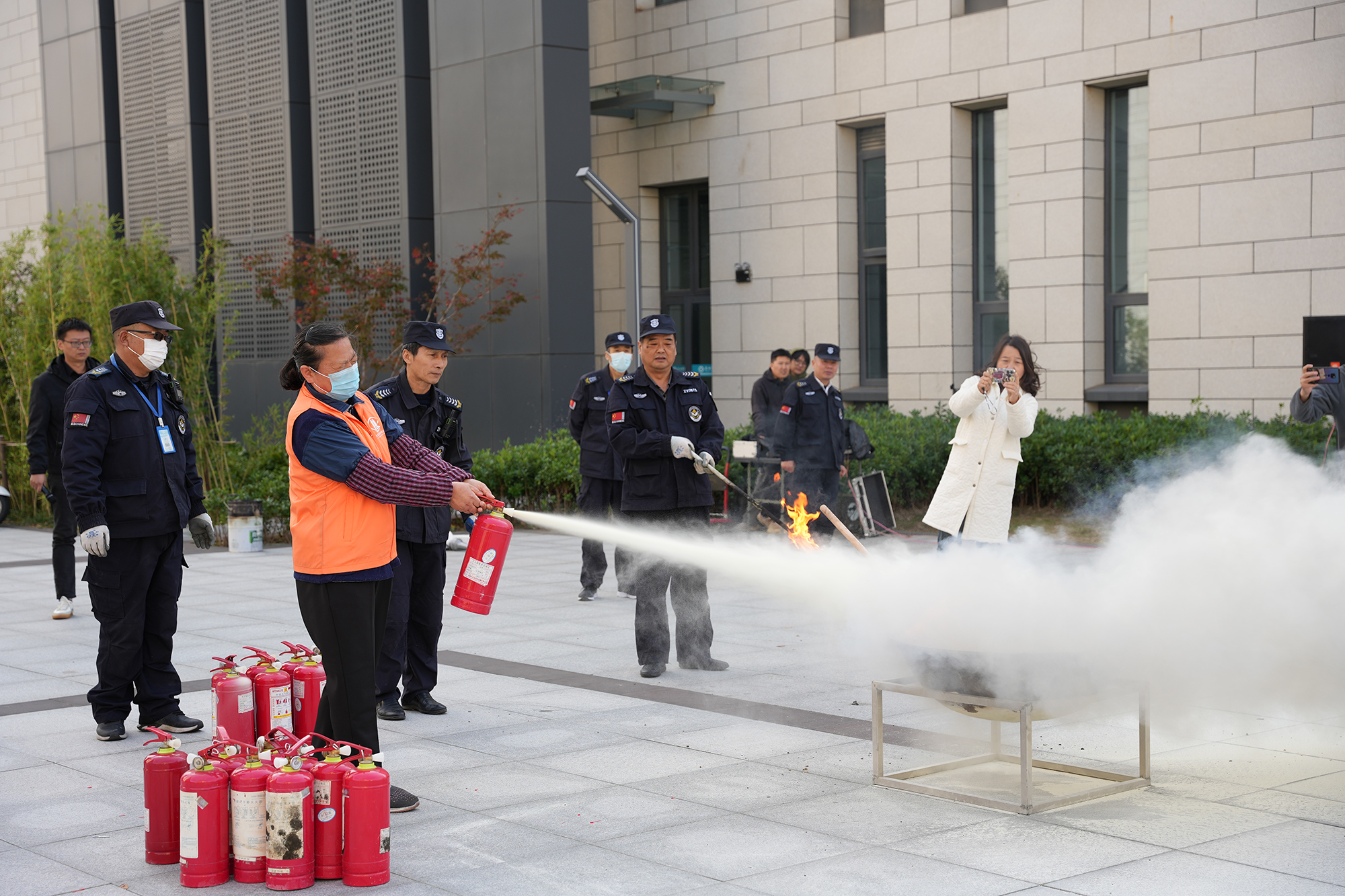 随后,校党委常委、副校长卜慧芬对此次疏散演练进行总结点评。她强调,一是要树牢消防安全意识;二是要遵守消防法规制度;三是要锻炼疏散灭火能力。陈根怀给同学们普及了消防安全知识、火灾逃生自救技能,并现场演示了灭火器的正确使用方法。微型消防站队员示范了快速穿战斗服。部分学生代表和高教后勤员工体验了使用灭火器进行灭火。
