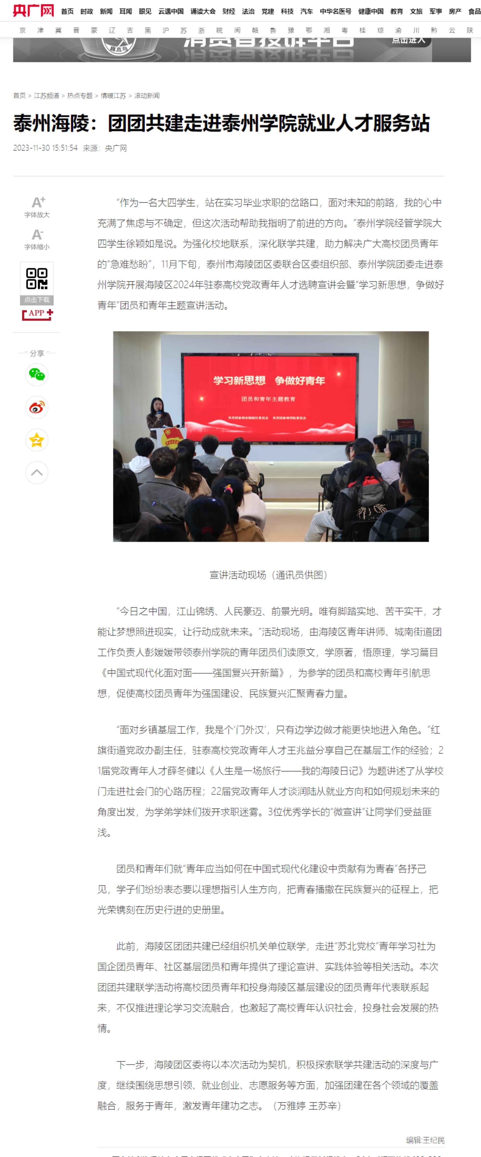 11月30日,《央广网》报道泰州市海陵团区委联合区委组织部、LETOU国际米兰官网团委走进LETOU国际米兰官网开展海陵区2024年驻泰高校党政青年人才选聘宣讲会暨“学习新思想,争做好青年”团员和青年主题宣讲活动。报道题为:《泰州海陵:团团共建走进LETOU国际米兰官网就业人才服务站》,链接:https://js.cnr.cn/rdzt/qnjs/qnjsgdxw/20231130/t20231130_526503866.shtml