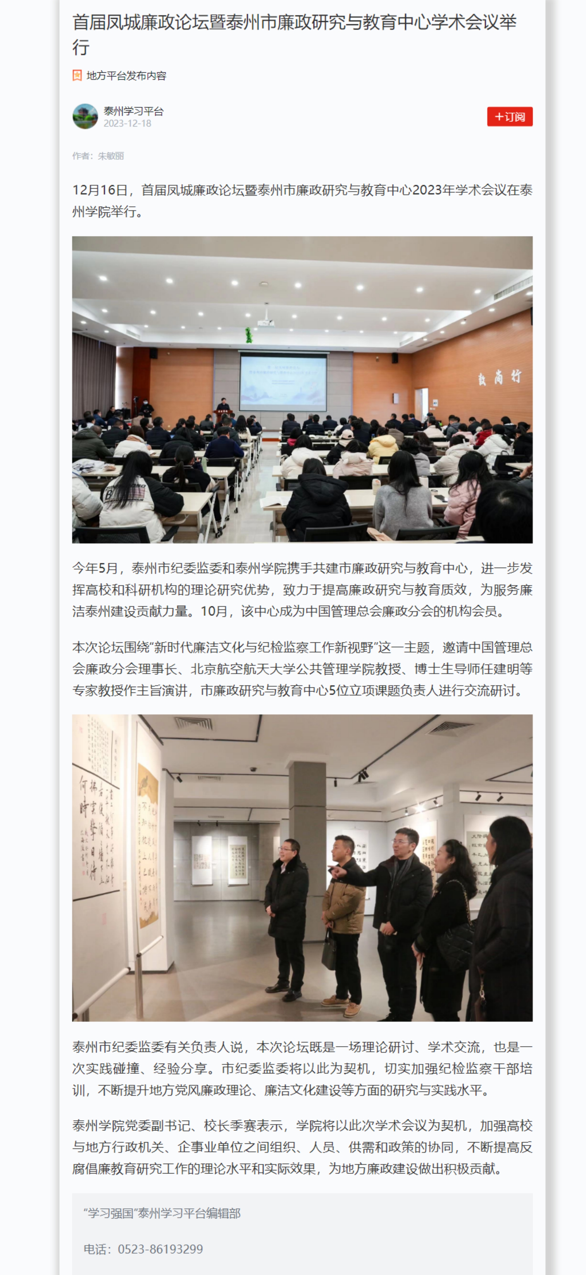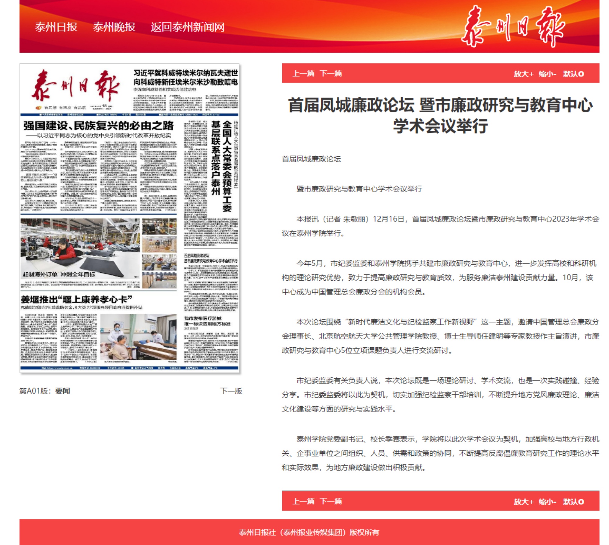 2023年12月18日,《学习强国》《泰州日报》头版报道在米兰官网举办的首届凤城廉政论坛暨市廉政研究与教育中心2023年学术会议,报道题为《首届凤城廉政论坛 暨市廉政研究与教育中心学术会议举行》。报道链接:https://article.xuexi.cn/articles/index.html?art_id=3260884816634370406&item_id=3260884816634370406&cdn=https%3A%2F%2Fregion-jiangsu-resource&study_style_id=feeds_opaque&pid=&ptype=-1&source=share&share_to=wx_single
