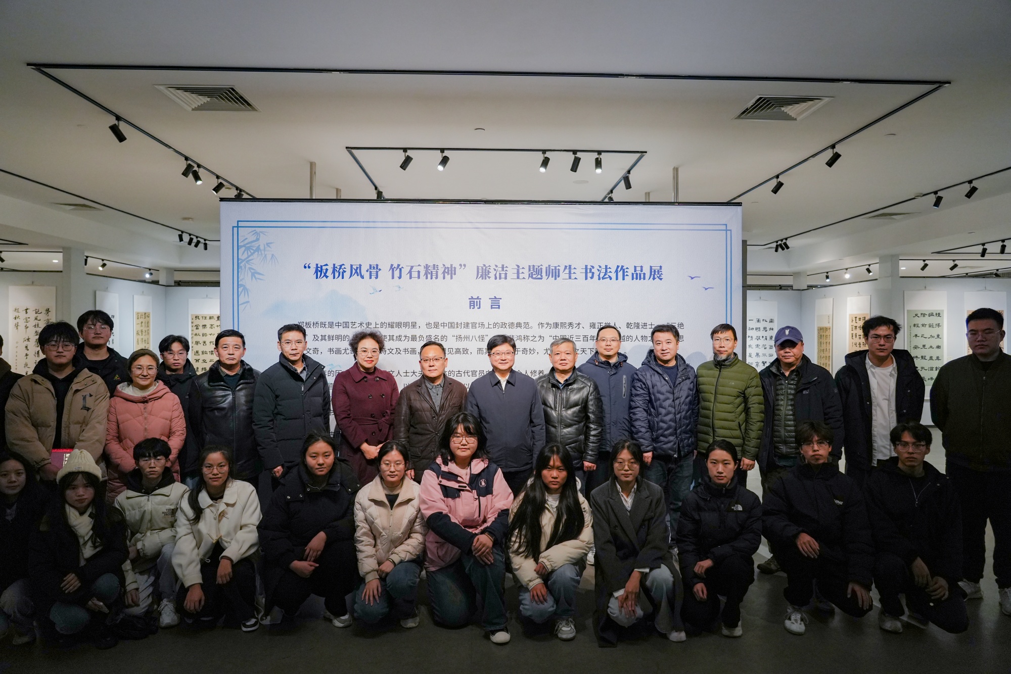 本次展览由校纪委主办,党委宣传部、党委统战部协办,泰州市廉政研究与教育中心、美术学院党总支联合承办。展览共征集师生参展作品90幅,作品书体形式丰富,书写内容均源自郑板桥诗词、楹联等作品,既是师生对板桥文学作品的再创造、再演绎,也是一堂生动的廉洁教育实践课。
