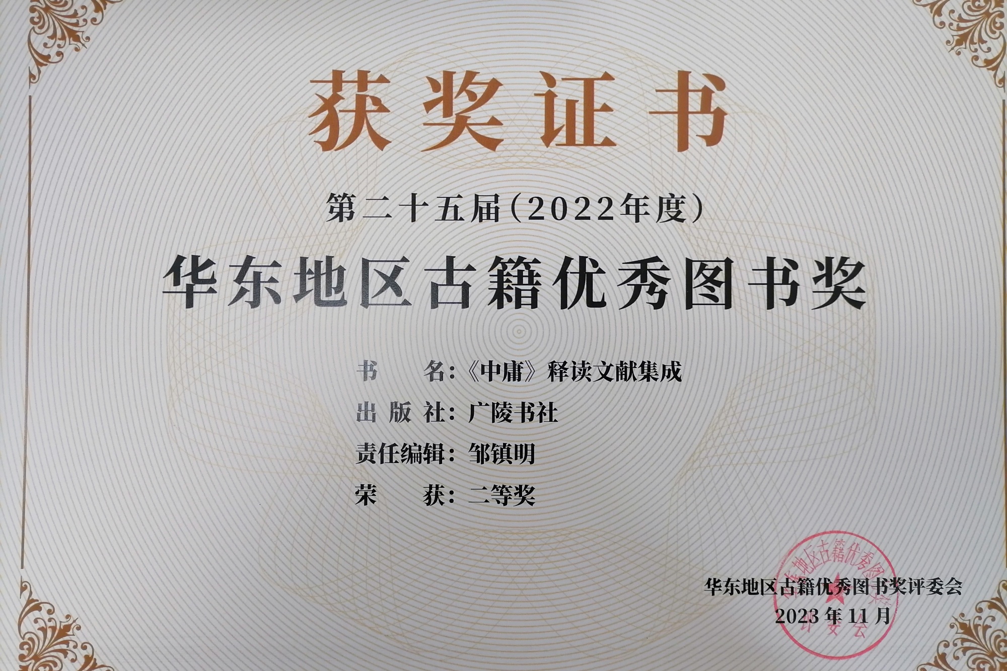 近日,人文学院副教授刘佩德博士的专著《<中庸>释读文献集成》,获评第二十五届华东地区古籍优秀图书奖二等奖。该书2022年由扬州广陵书社出版。