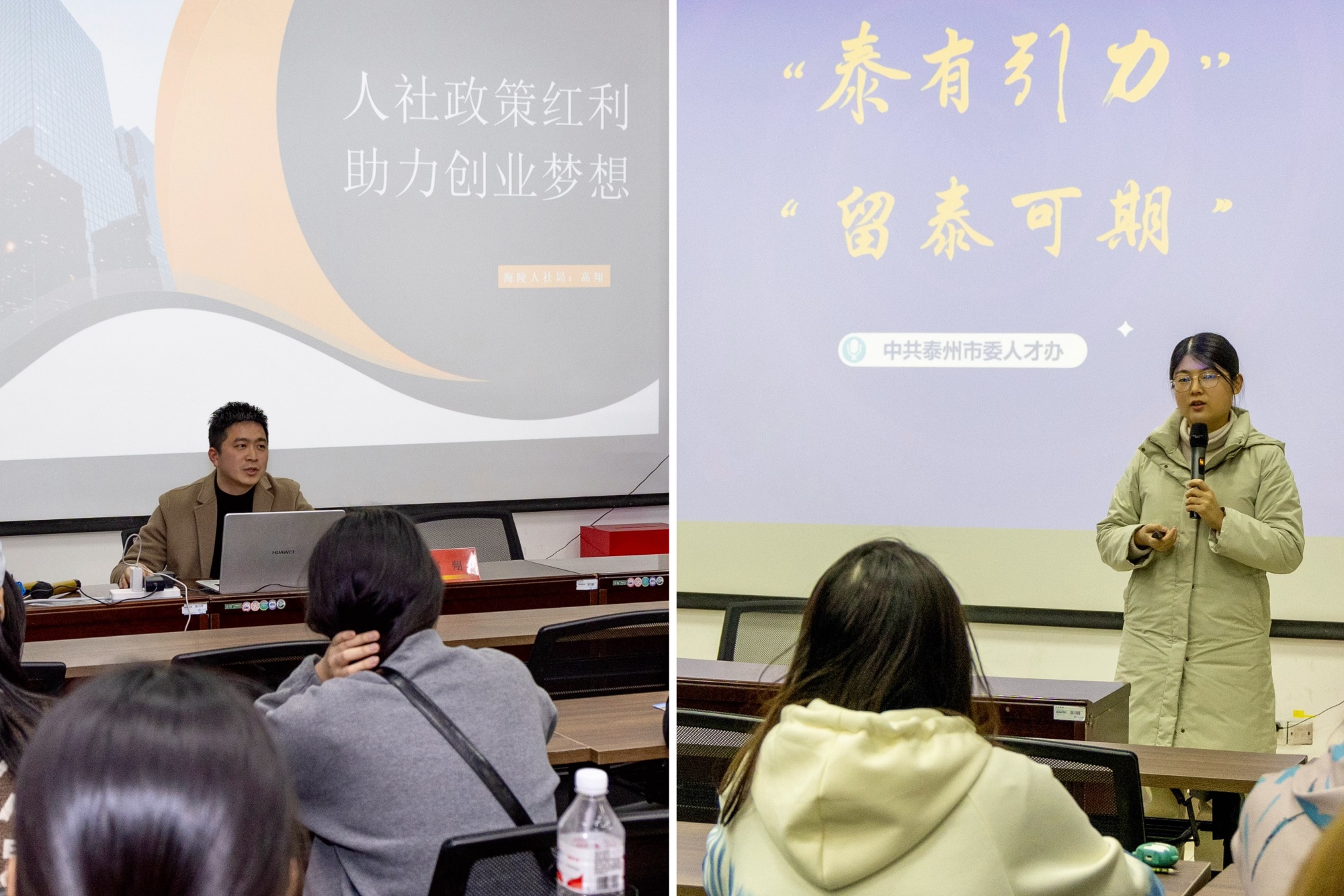 活动中,海陵区人社局就业创业科高翔以《人社政策红利 助力创业梦想》为主题,重点介绍大学生关注度较高的求职创业补贴、创业担保贷款政策、大学生创业扶持政策等内容,帮助学生树立正确创业意识,充分了解各项政策优惠,促进创业引领就业;泰州市委组织部人才发展服务中心董税涛聚焦青年人才留泰政策和福利,详细介绍留泰补贴、生活补贴、购房券、租房补贴等政策,并对青年人才福利卡——青凤卡作推介,为推动全市招才引才、加快人才集聚奠定基础。