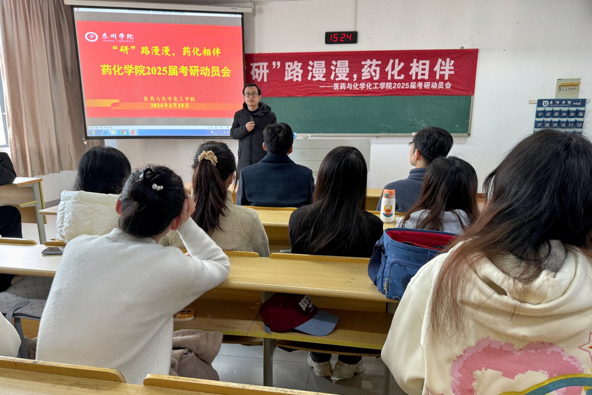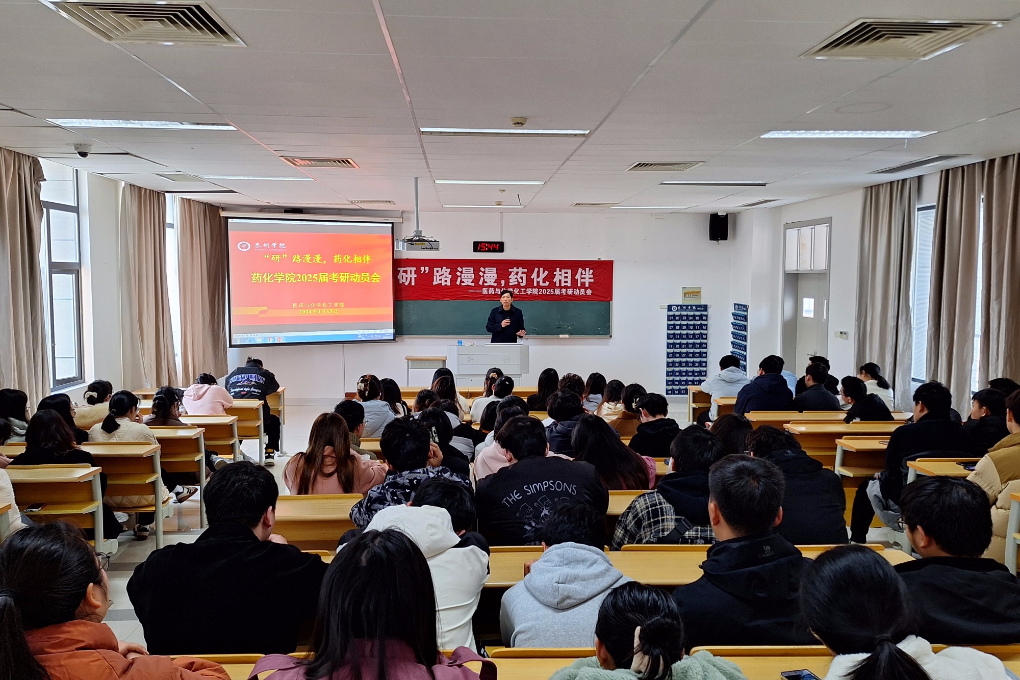 为进一步激励2025届毕业生备战考研,营造积极向上、勇于拼搏的考研氛围,3月15日,医药与化学化工学院在教学楼1406召开主题为“研路漫漫,药化相伴”2025届考研动员大会。学院党总支书记徐小兵、党总支副书记张红祥、副院长朱禹以及班主任、辅导员参加本次动员会。