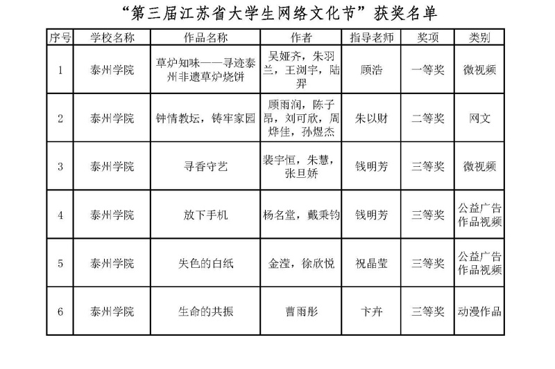 近日,第三届“江苏省大学生网络文化节”评比结果发布,米兰官网推荐作品获一等奖1项,二等奖1项,三等奖4项。其中,《草炉知味——寻迹泰州非遗草炉烧饼》《钟情教坛,铸牢家园》《放下手机》三个作品推荐参加国赛。