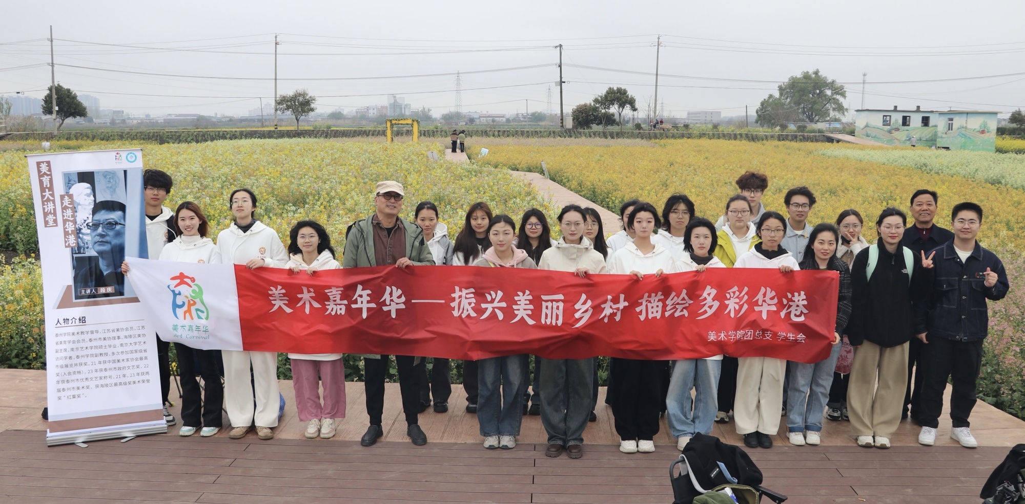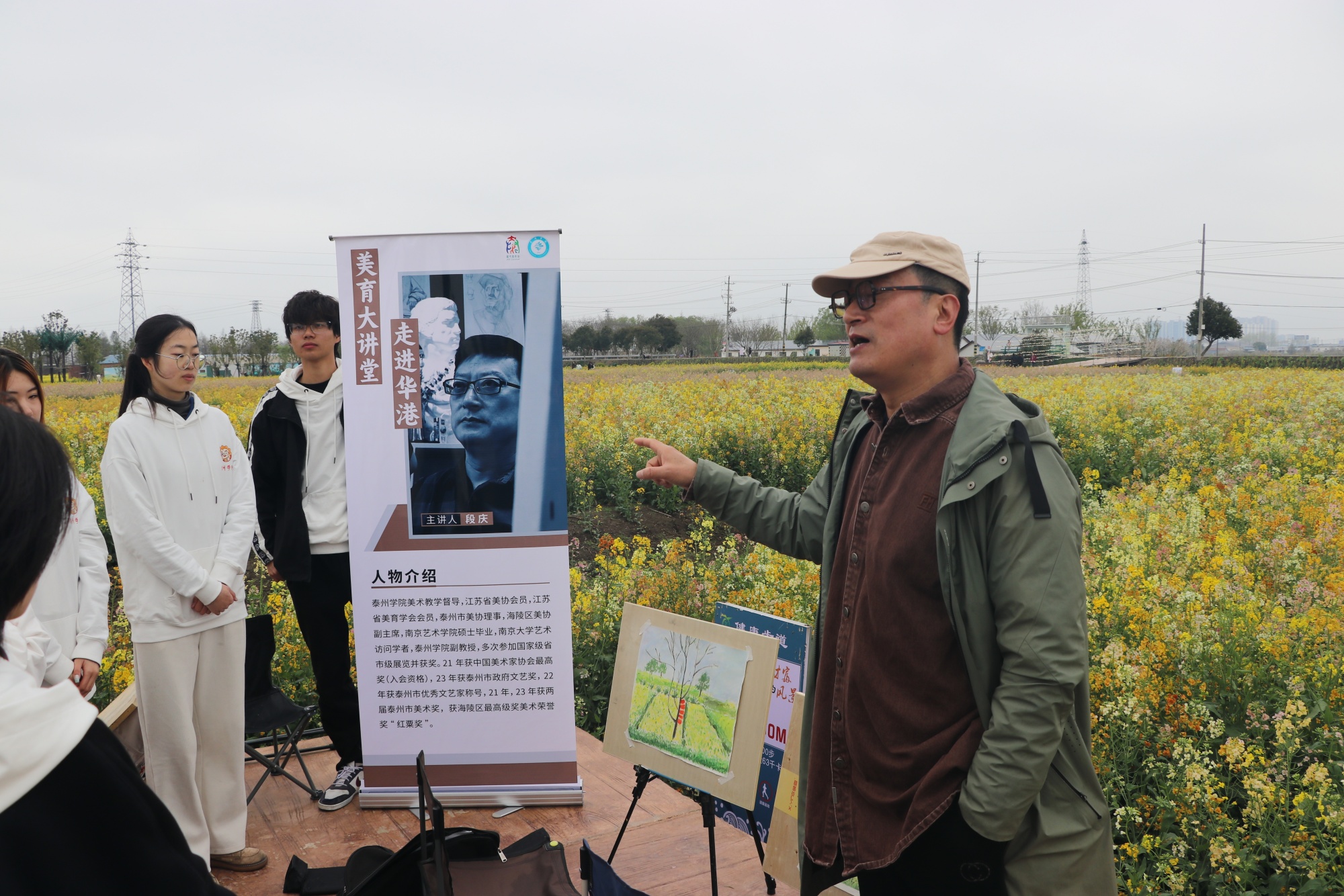 美术学院副教授段庆在华港镇垎岸油菜花田现场给30余名在校大学生及当地村民、游客作美育讲座。段庆结合自己近期所绘制的系列油菜花作品展开,着重讲解了创作油菜花作品的技能和技巧,并对学生们的油菜花作品进行点评及指导。段庆表示,艺术创作要走进美丽乡村,善于发现生活中的美,要学会用手中的画笔扮靓美丽乡村,赋能乡村振兴。