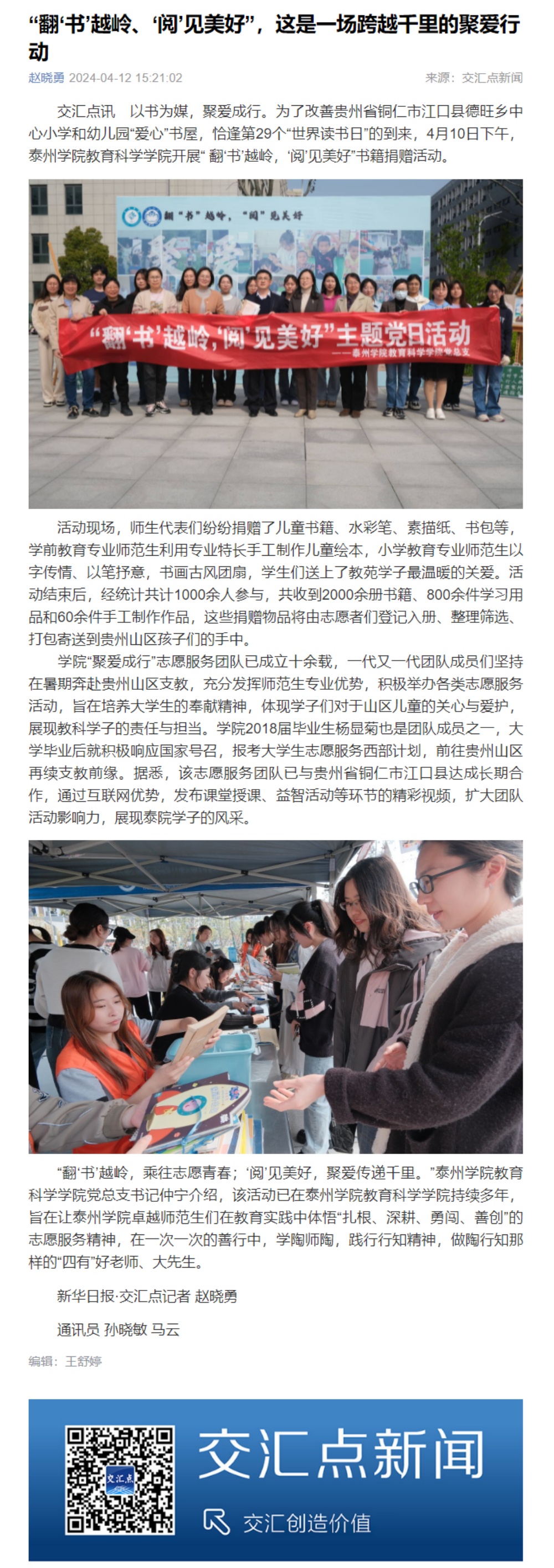 2024年4月12日,《交汇点新闻》报道米兰官网LETOU国际米兰官网开展的“ 翻‘书’越岭,‘阅’见美好”书籍捐赠活动,报道链接:https://jhd.xhby.net/share-webui/detail/s6618e0dfe4b0a2749b87142f