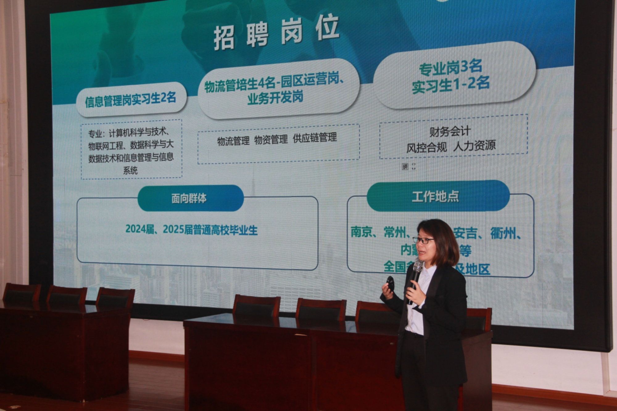 招聘宣讲会在艺术楼C2108举办,中国物流集团有限公司人力资源部总经理杨美丽面向80名大四物流管理专业学生开展招聘宣讲,详细介绍中国物流集团的行业背景、平台发展和薪资福利,鼓励现场同学踊跃尝试、锻炼自我。同学们积极投递简历,现场气氛热烈。