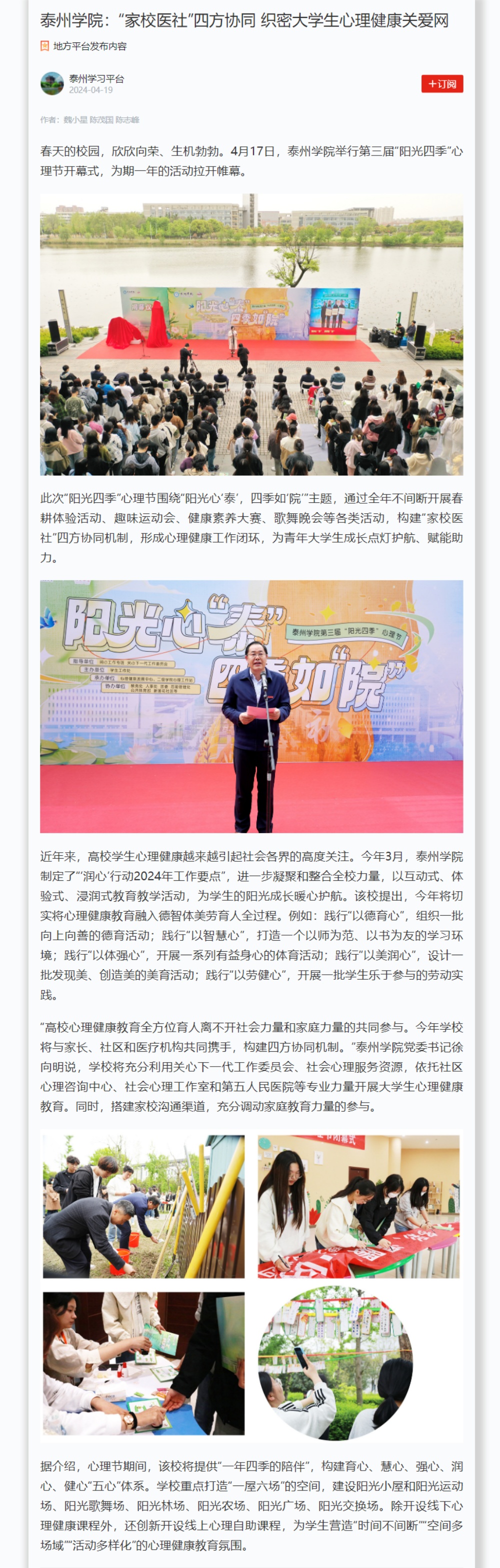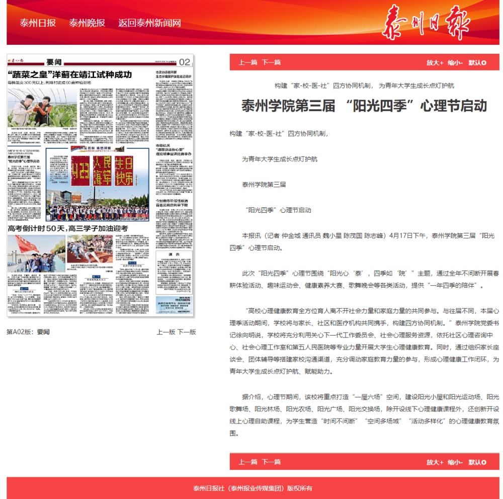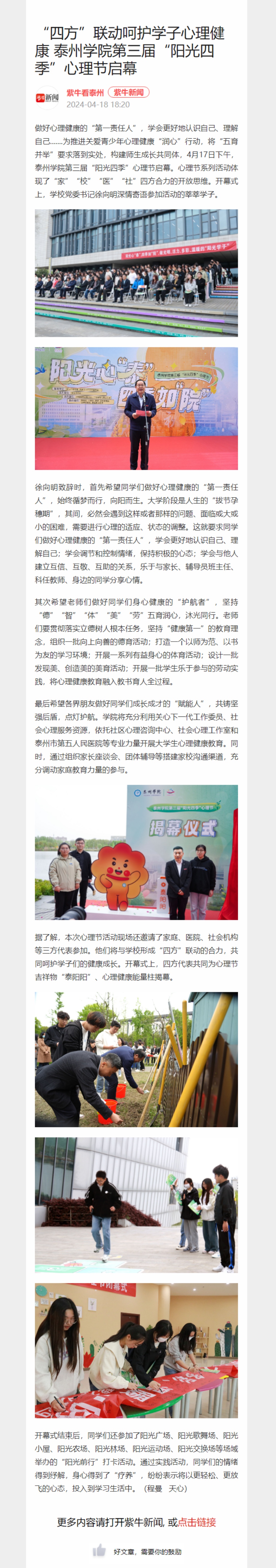 2024年4月18-20日,《学习强国》《江苏教育发布》《紫牛新闻》《泰州日报》《泰州晚报》等多个媒体平台报道米兰官网第三届“阳光四季”心理节活动。报道链接如下: