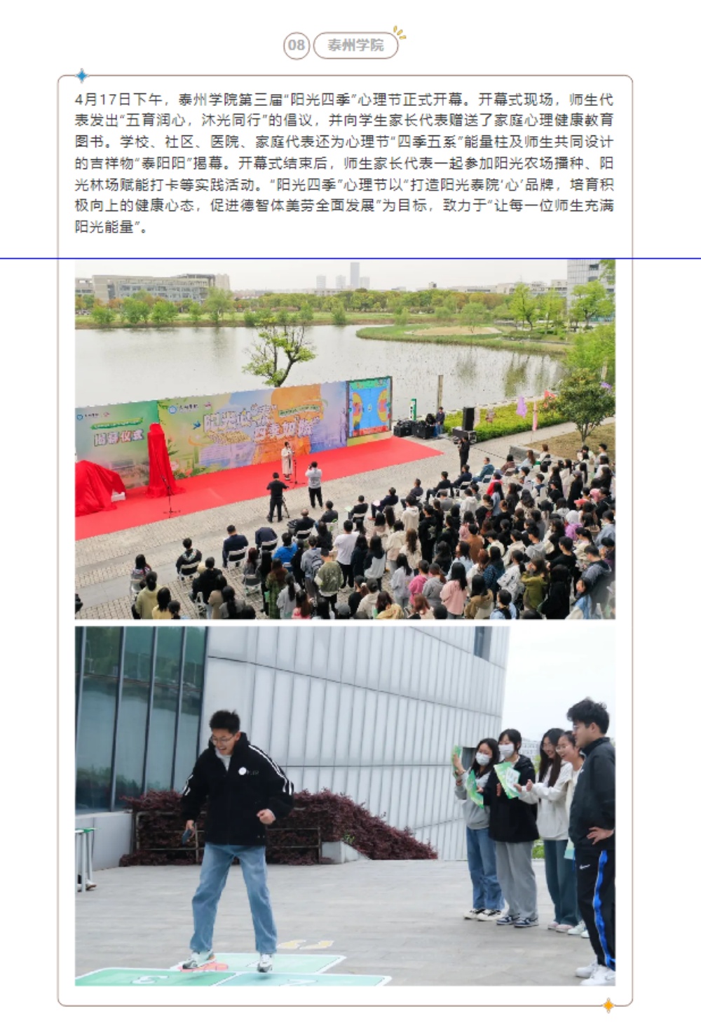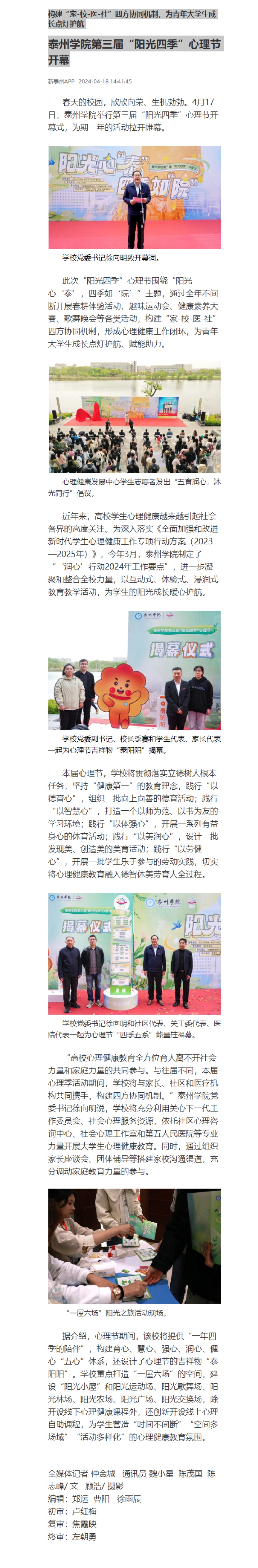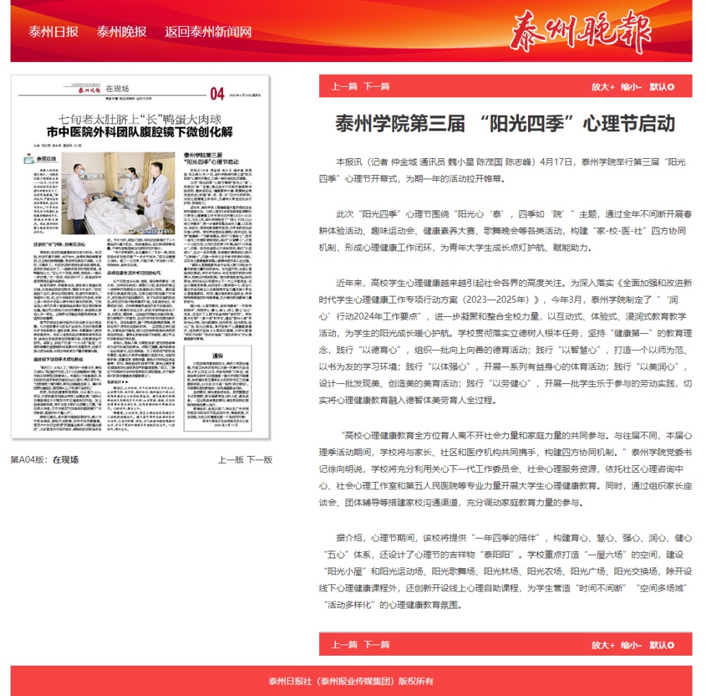 2024年4月18-20日,《学习强国》《江苏教育发布》《紫牛新闻》《泰州日报》《泰州晚报》等多个媒体平台报道米兰官网第三届“阳光四季”心理节活动。报道链接如下: