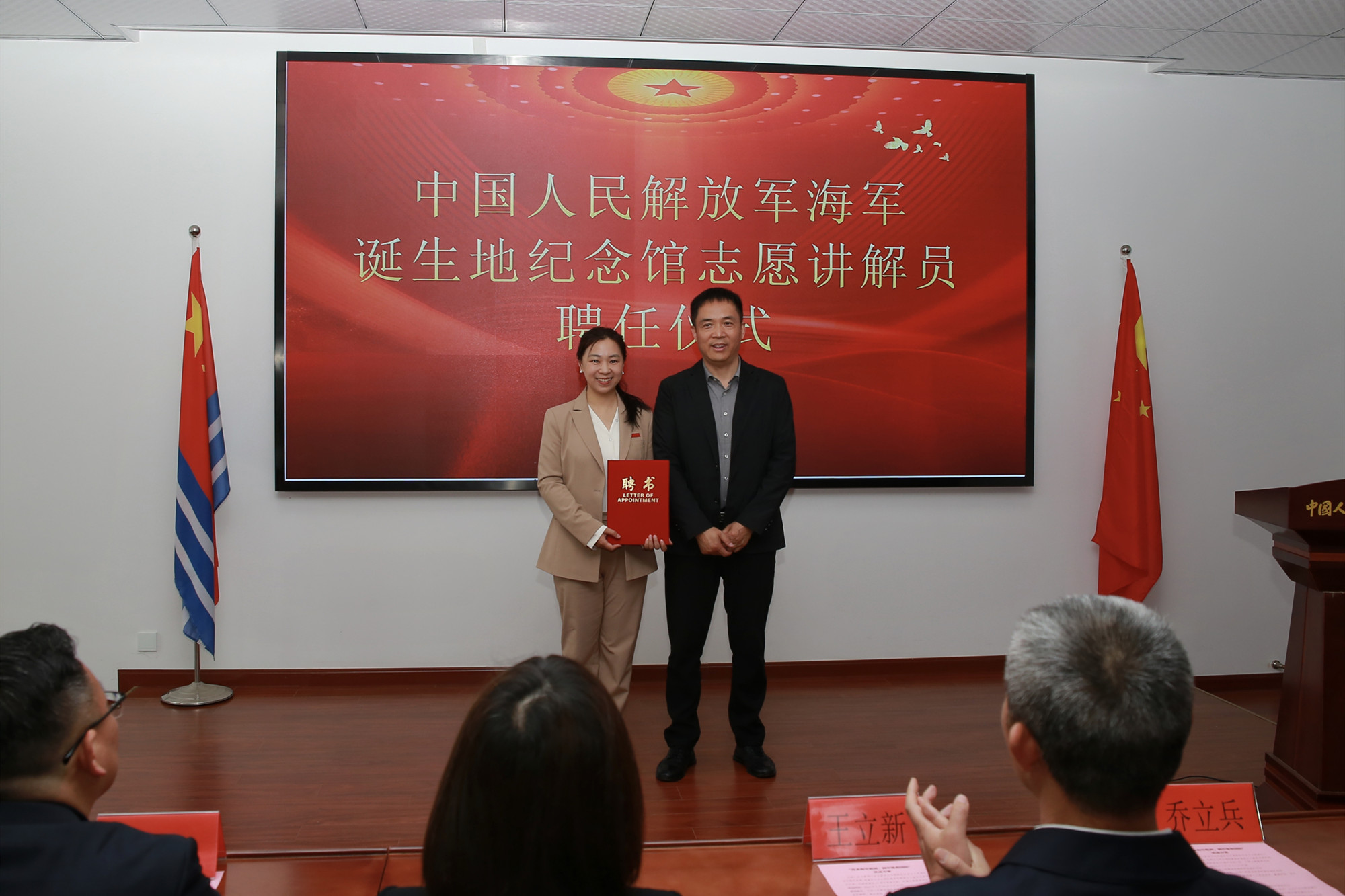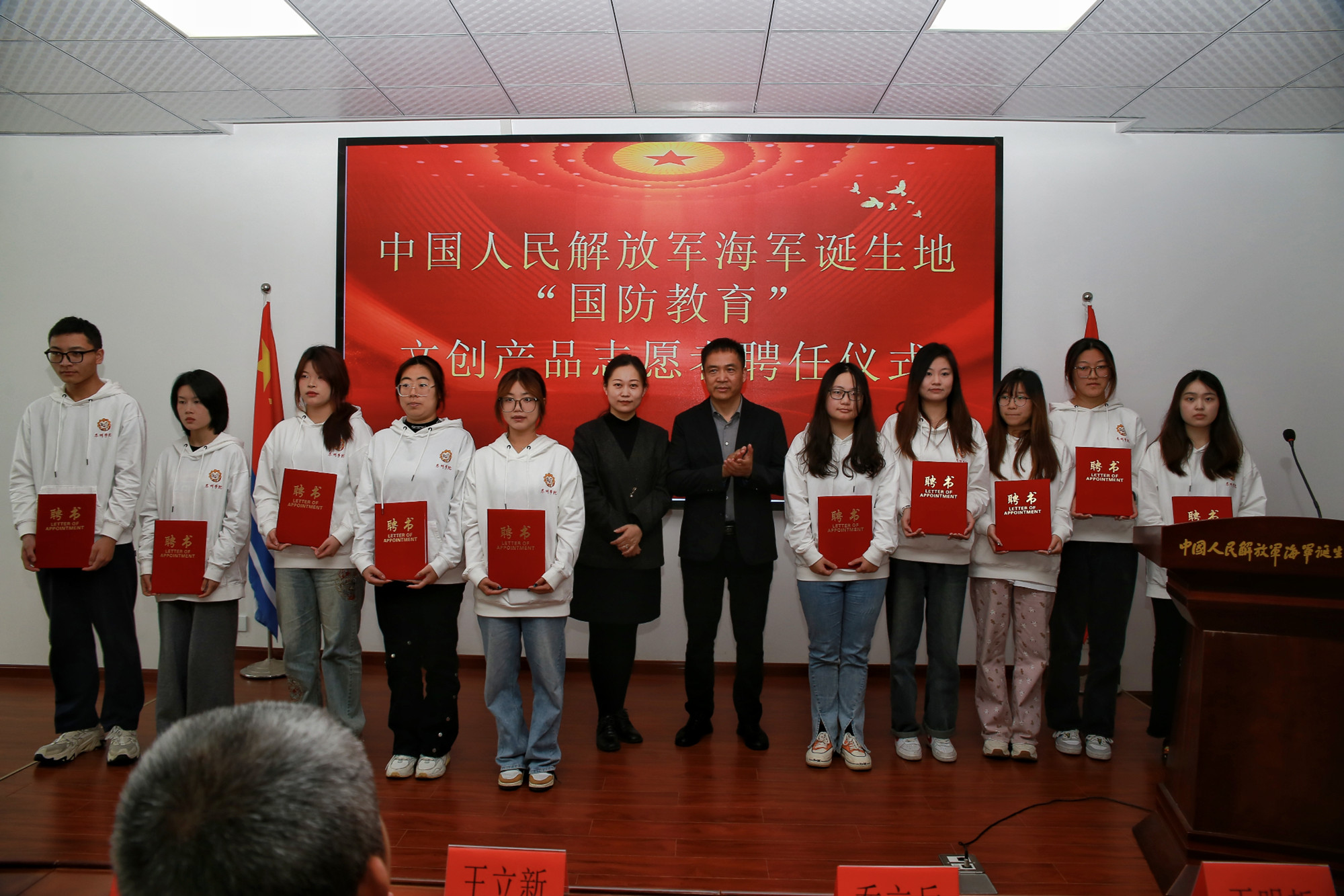 活动中,海纪馆为米兰官网“国防教育”文创产品志愿者和志愿讲解员颁发聘书,参会领导为LETOU国际米兰官网“静待花开”铸魂育人工作室协同育人基地和LETOU国际米兰官网爱国主义教育基地揭牌。