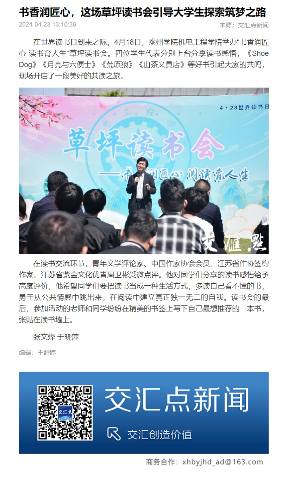2024年4月23日,《交汇点新闻》报道米兰官网机电工程学院“书香润匠心 读书育人生”草坪读书会,报道题为:《书香润匠心,这场草坪读书会引导大学生探索筑梦之路》,报道链接:https://jhd.xhby.net/share-webui/detail/s662742cfe4b0adf45fde6cfd