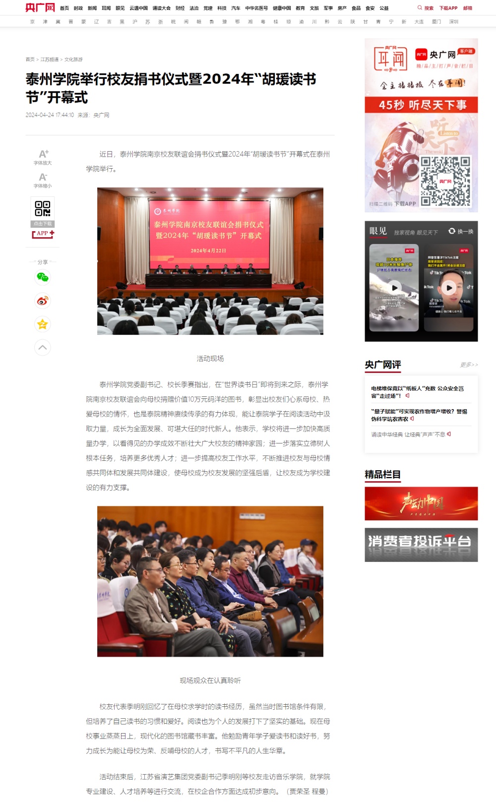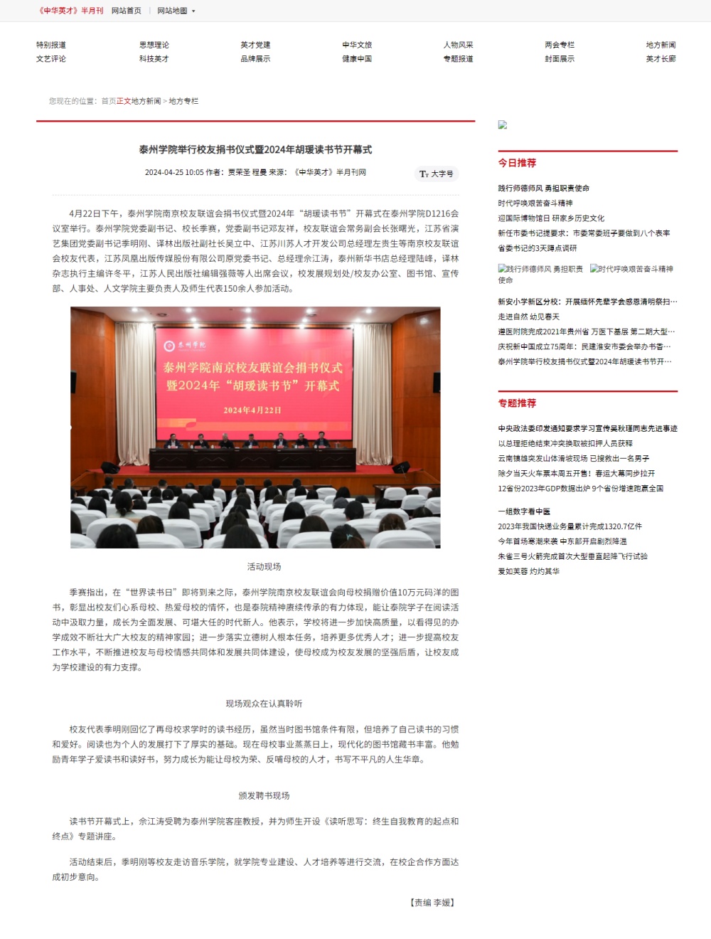 2024年4月24日、25日,《央广网》《中华英才》分别报道米兰官网校友捐书仪式暨2024年“胡瑗读书节”开幕式。