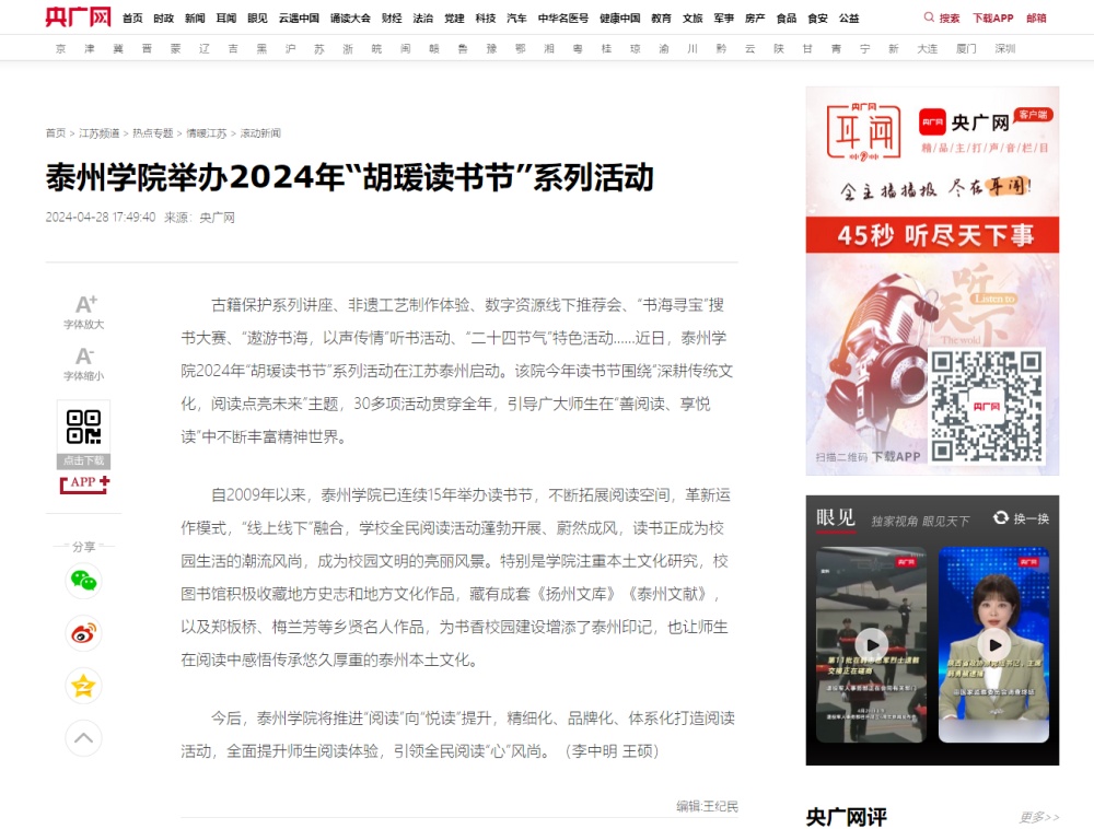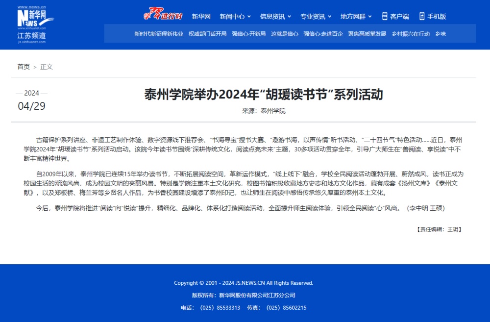 2024年4月28、29日,《央广网》《新华网》分别报道米兰官网“胡瑗读书节”系列活动。