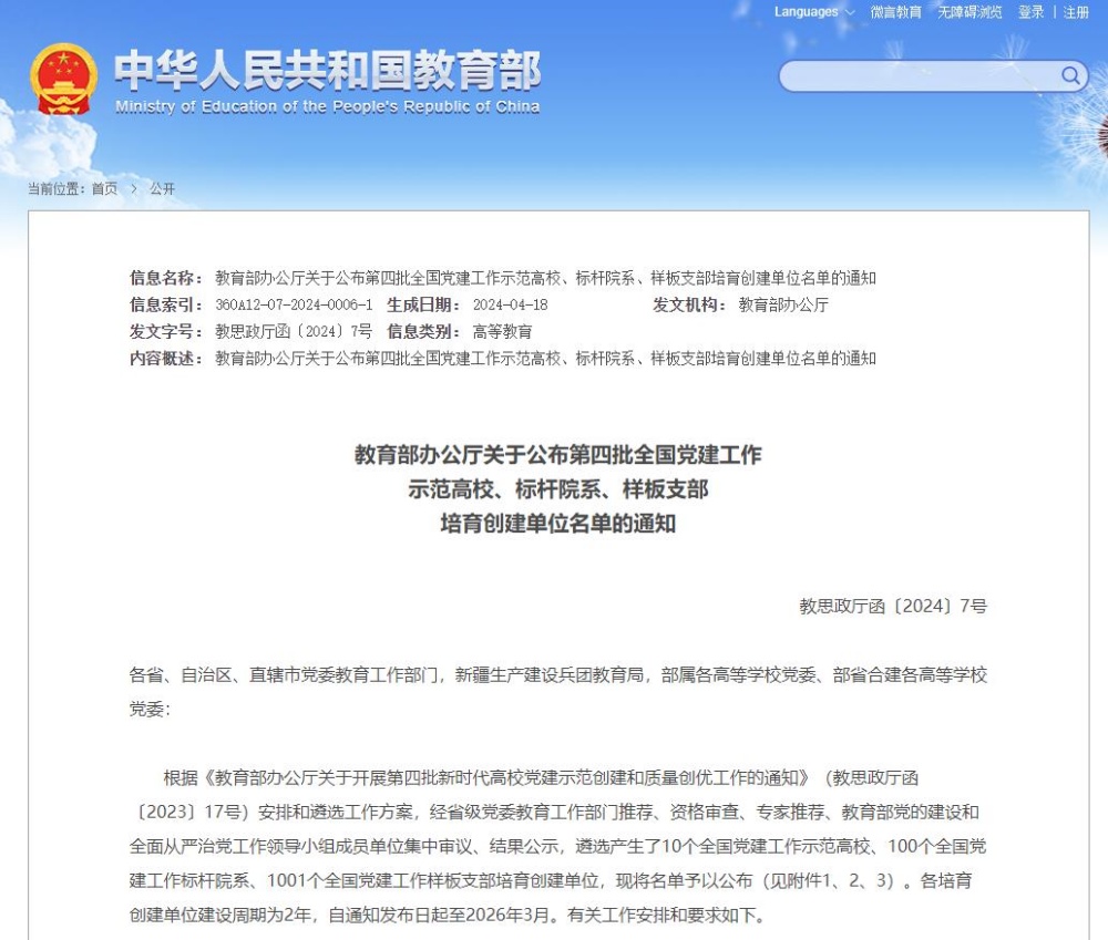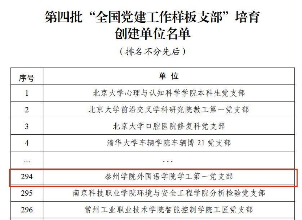 据悉,此次评选经江苏省委教育工委推荐、资格审查、专家推荐、教育部党的建设和全面从严治党工作领导小组成员单位集中审议、结果公示,遴选产生了10个全国党建工作示范高校、100个全国党建工作标杆院系、1001个全国党建工作样板支部培育创建单位。