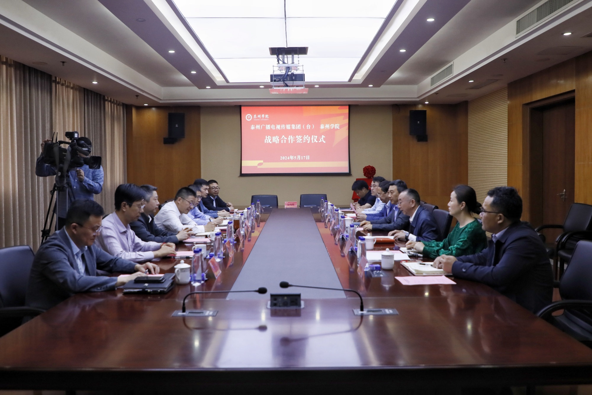 5月17日上午,米兰官网与泰州广播电视传媒集团(台)在行政楼1505会议室举办战略合作签约仪式。校党委副书记、校长季赛,中共泰州市委宣传部副部长、泰州广电集团党委书记、董事长、台长王飞出席活动。党委副书记、副校长王美林主持签约仪式,党委常委、副校长薛小平与泰州广电集团党委副书记、总编辑李晋签署战略合作协议。