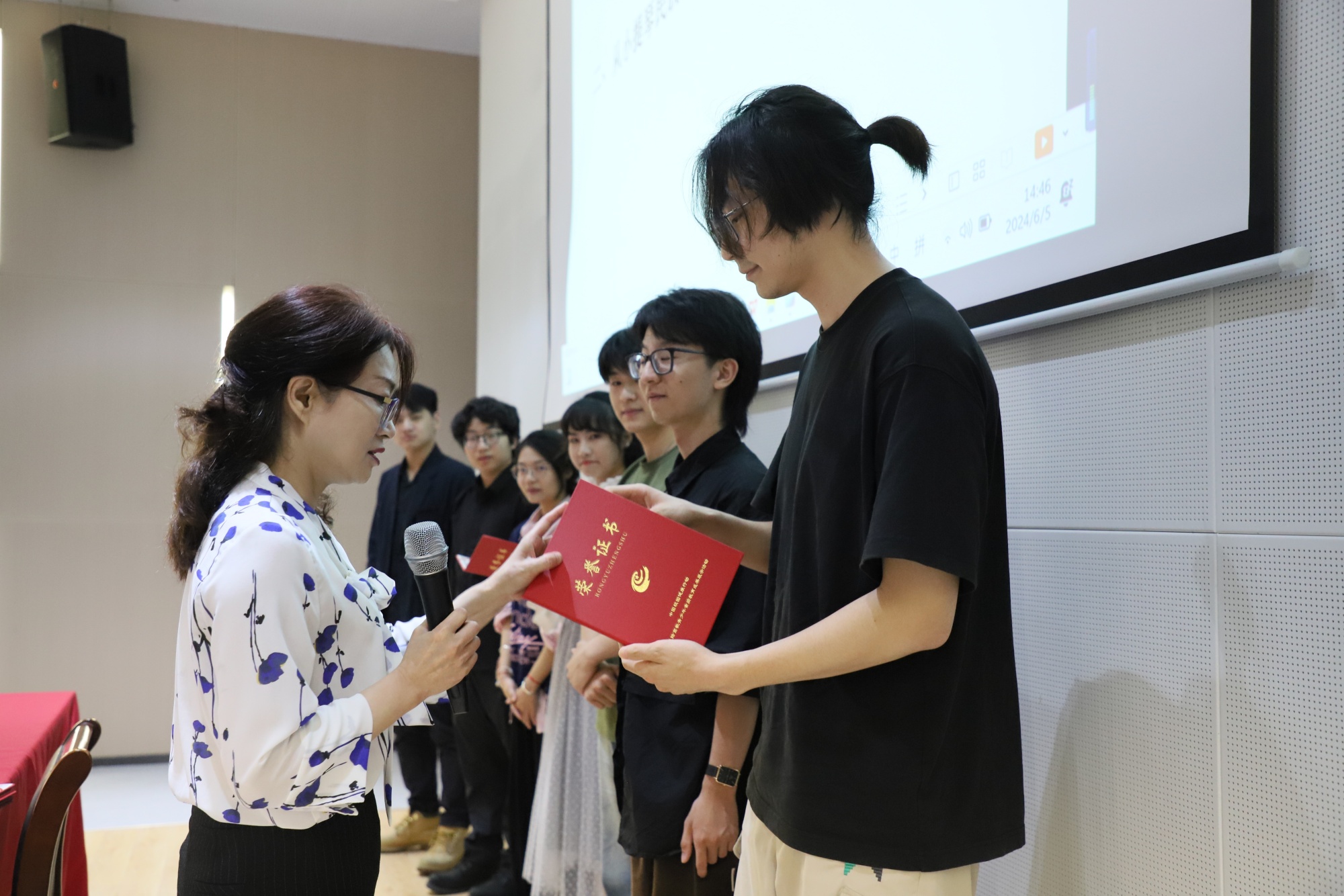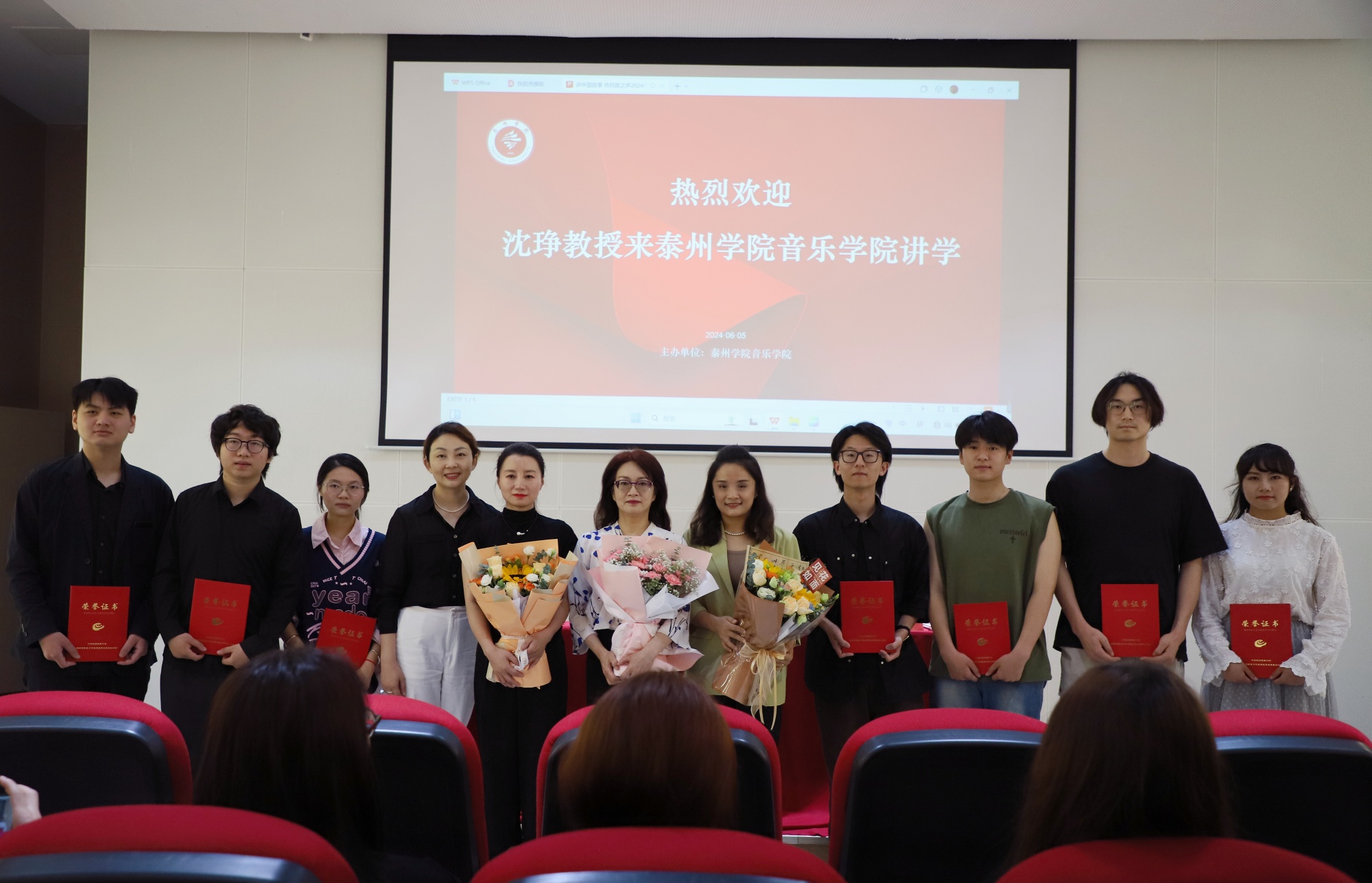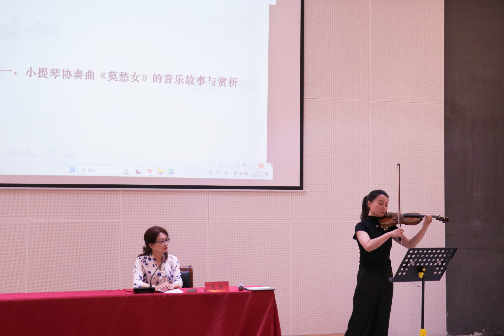 讲座期间,沈琤教授与音乐学院青年教师进行了现场互动,王雪澄老师演奏了小提琴协奏曲《莫愁女》的主题片段,赢得了在场观众的热烈掌声。沈琤教授还担任颁奖嘉宾,为去年暑期赴延安参赛,荣获“第七届校园交响音乐节展演”一等奖的同学颁发荣誉证书。