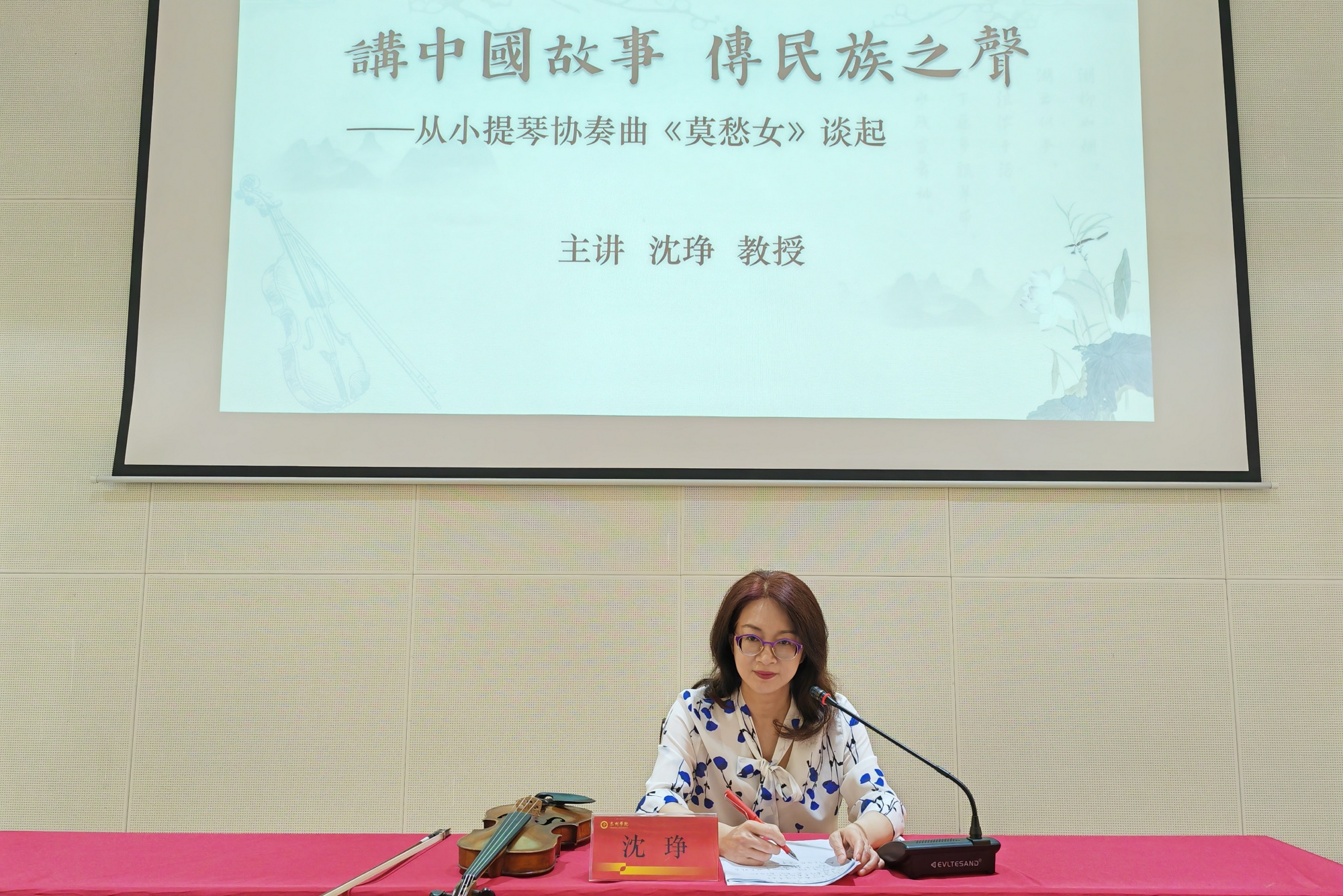 沈琤教授以“讲中国故事、传民族之声——从小提琴《莫愁女》协奏曲讲起”为题,带领师生聆听、赏析了小提琴协奏曲《莫愁女》的精彩演奏,解读了作品的音乐内涵和流传千年的民间爱情故事,以独特视角剖析了中西文化的异同,阐述了新时代文化自信的重要性,让在场的师生在视觉与听觉的双重享受中,感受到中国故事的无限魅力和民族音乐的深厚底蕴。