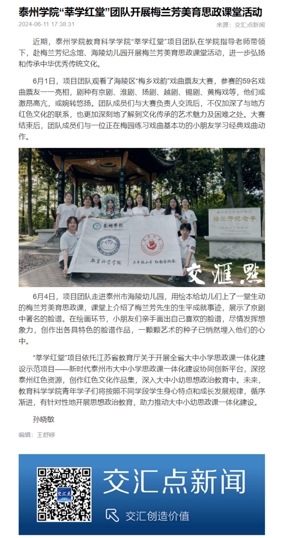 2024年6月11日,《交汇点新闻》报道LETOU国际米兰官网LETOU国际米兰官网“莘学红堂”项目团队赴梅兰芳纪念馆、海陵幼儿园开展梅兰芳美育思政课堂活动,报道题为:《LETOU国际米兰官网“莘学红堂”团队开展梅兰芳美育思政课堂活动》。
