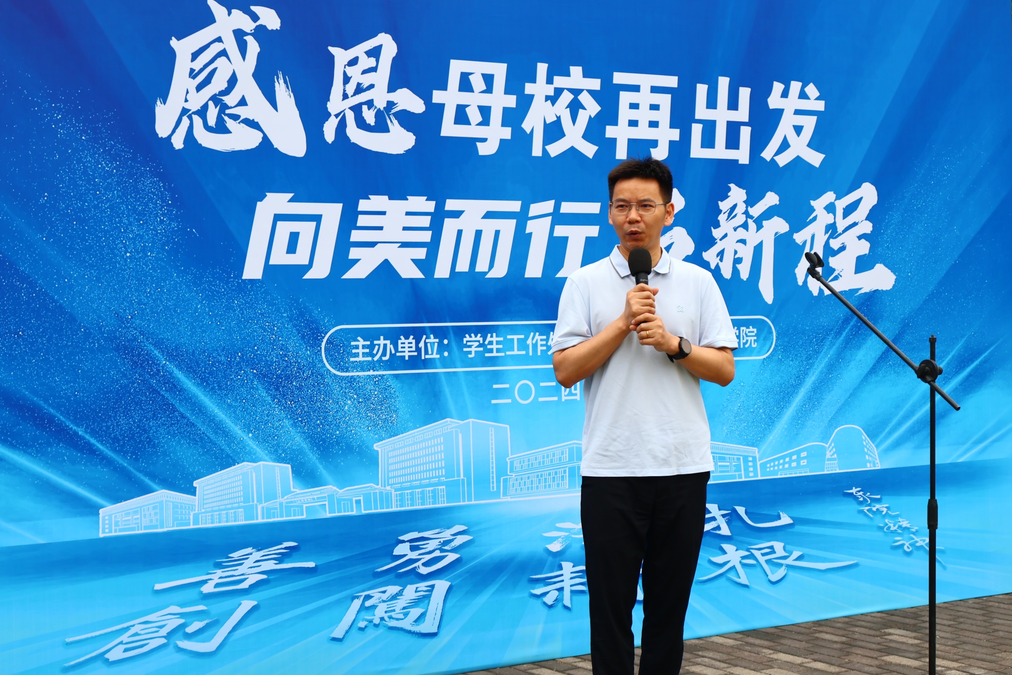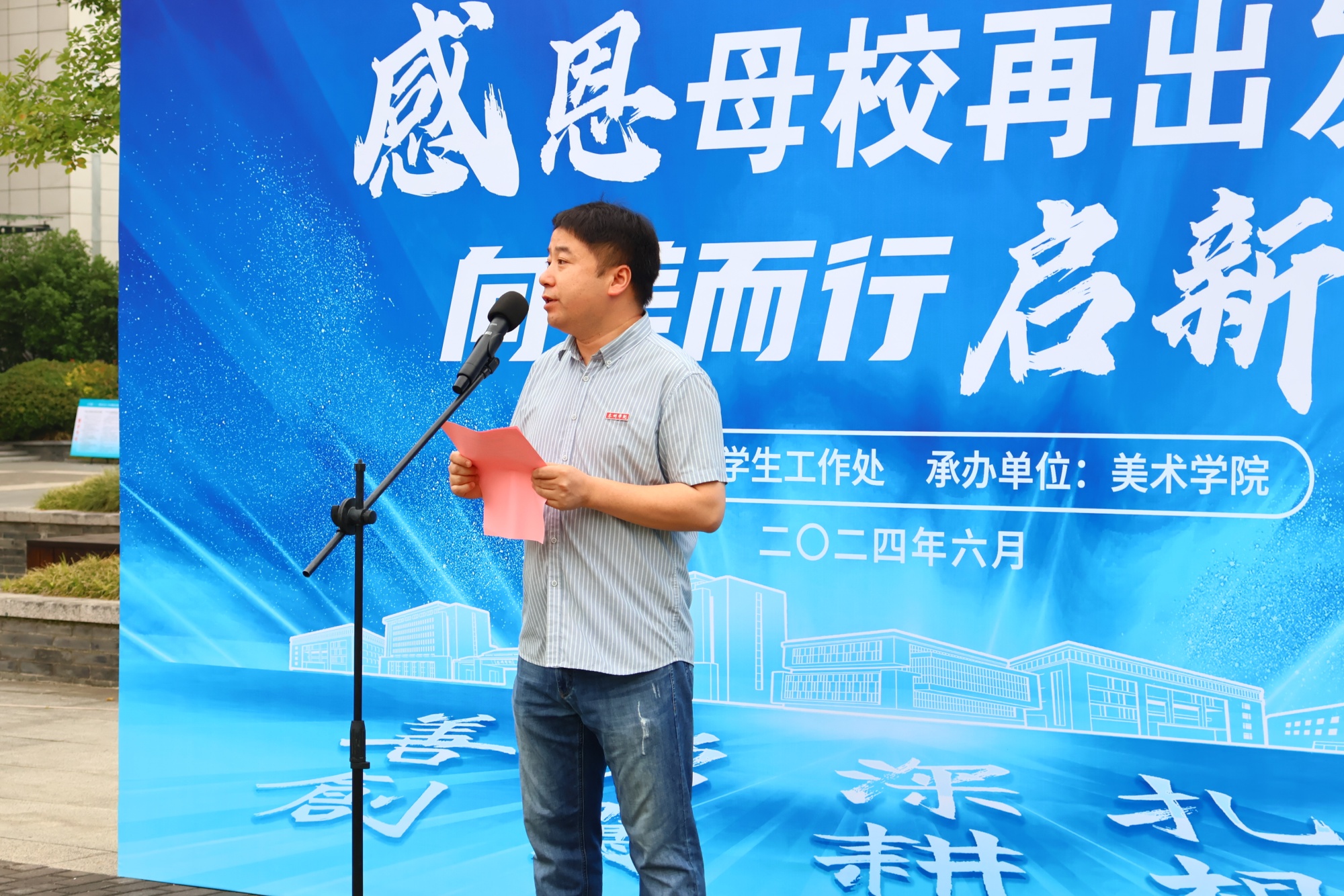 2020级绘画专业2班的王俊兮作为学生代表宣读《毕业生文明离校倡议书》,倡导同学们心怀感恩,树好榜样,遵守规定,有序离校。2020级视觉传达设计专业1班的邢正航作为优秀毕业生代表发言,呼吁毕业生们不要仅仅做技艺的传承者,更要做文化的传播者,用画笔描绘世界的美好,传递真善美的理念。