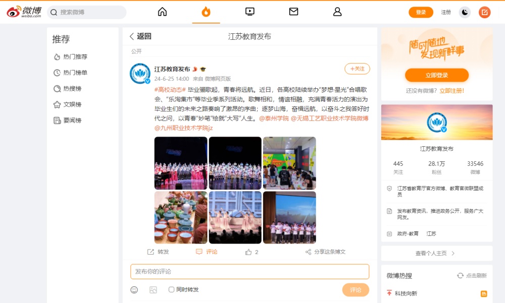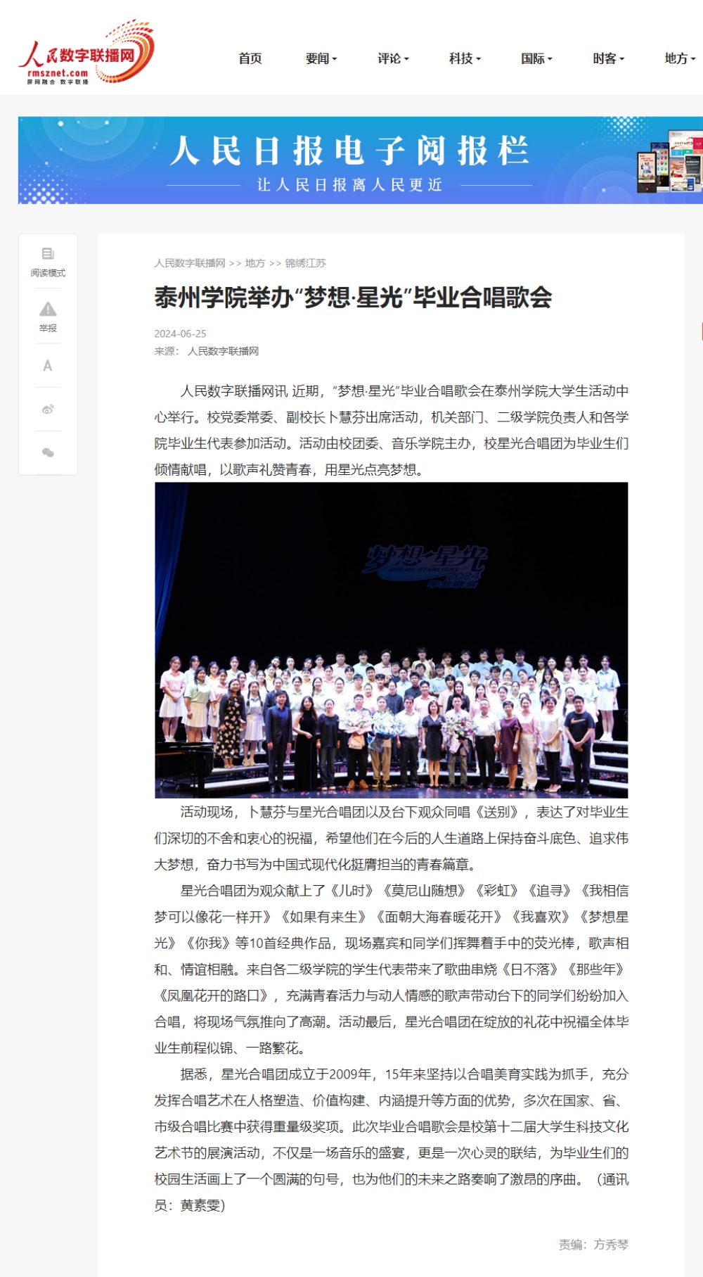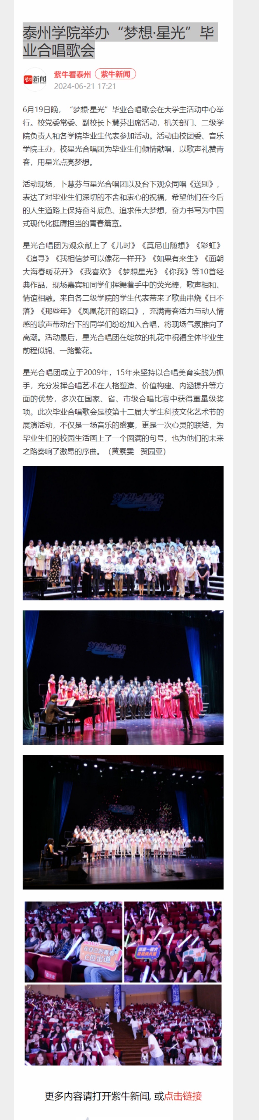 2024年6月21日《紫牛新闻》、6月25日《人民数字联播网》《江苏教育发布》微博分别报道《LETOU国际米兰官网举办“梦想·星光”毕业合唱歌会》。