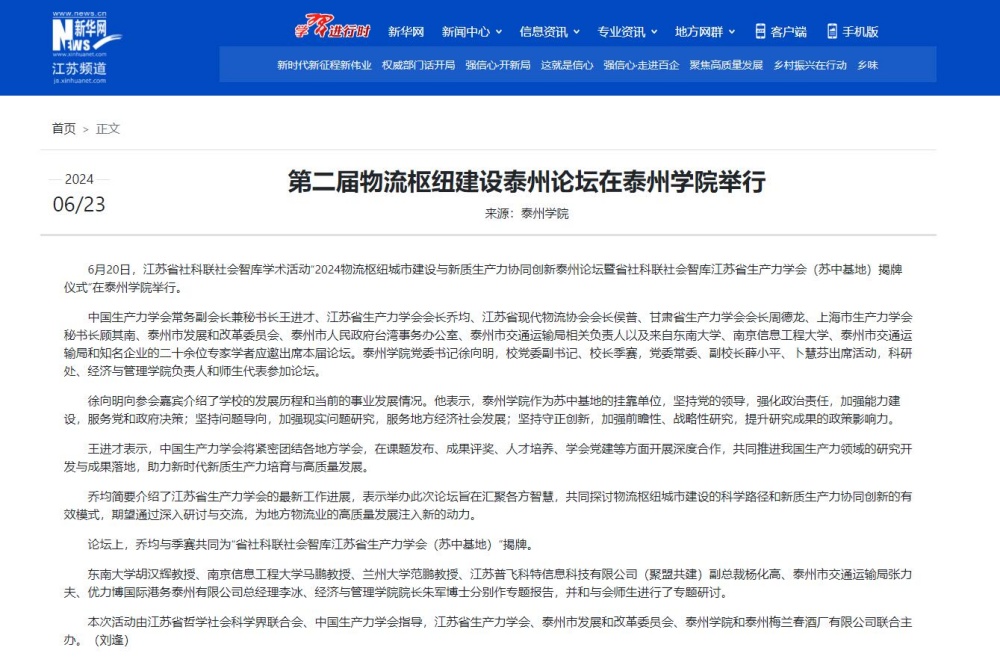 2024年6月23日,《新华网》报道在米兰官网举行的江苏省社科联社会智库学术活动“2024物流枢纽城市建设与新质生产力协同创新泰州论坛暨省社科联社会智库江苏省生产力学会(苏中基地)揭牌仪式”,报道题为:《第二届物流枢纽建设泰州论坛在LETOU国际米兰官网举行》,链接:http://js.news.cn/20240623/43a502b53f574b2382172c953a96d2fc/c.html