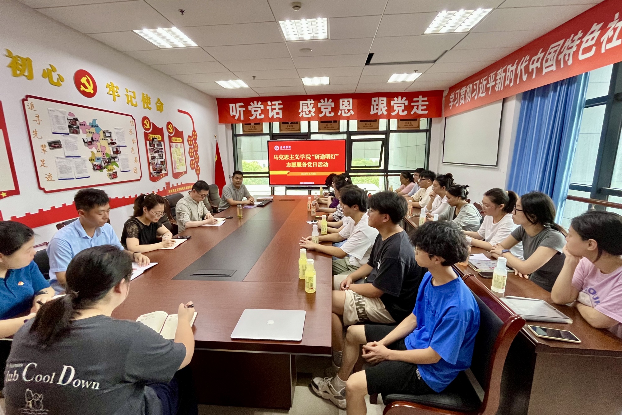 为贯彻落实立德树人根本任务,充分发挥基层党组织战斗堡垒作用和党员教师先锋模范作用,深入推进“研途明灯”引航计划,扎实助推考研工作,提升人才培养质量,8月8日下午,在学生工作处及各二级学院的协助下,马克思主义学院党总支在D2301会议室举办“研途明灯”志愿服务党日活动。马克思主义学院党总支书记陈志峰、院长刁龙及部分党员教师代表,考研学生代表等参加活动。
