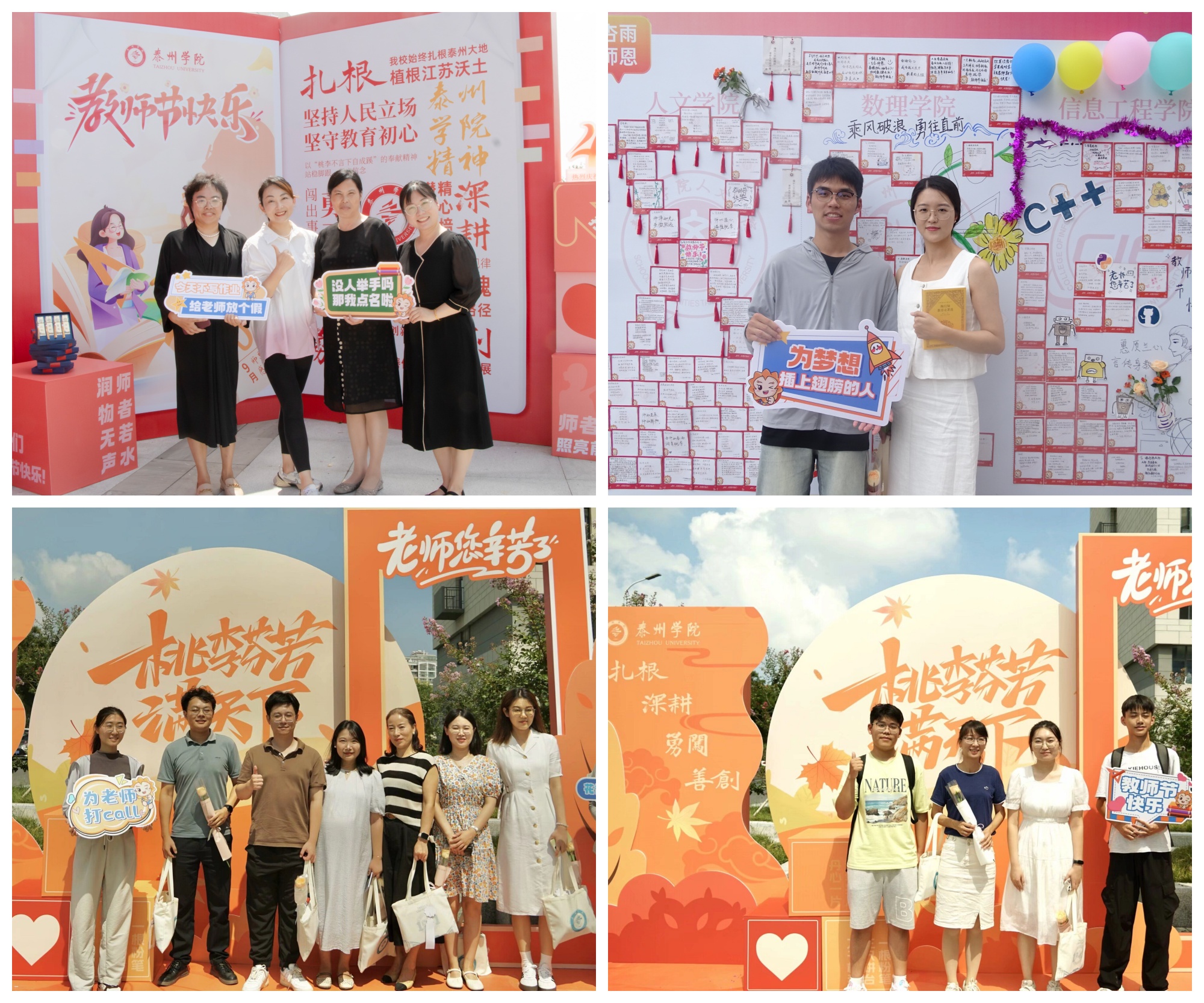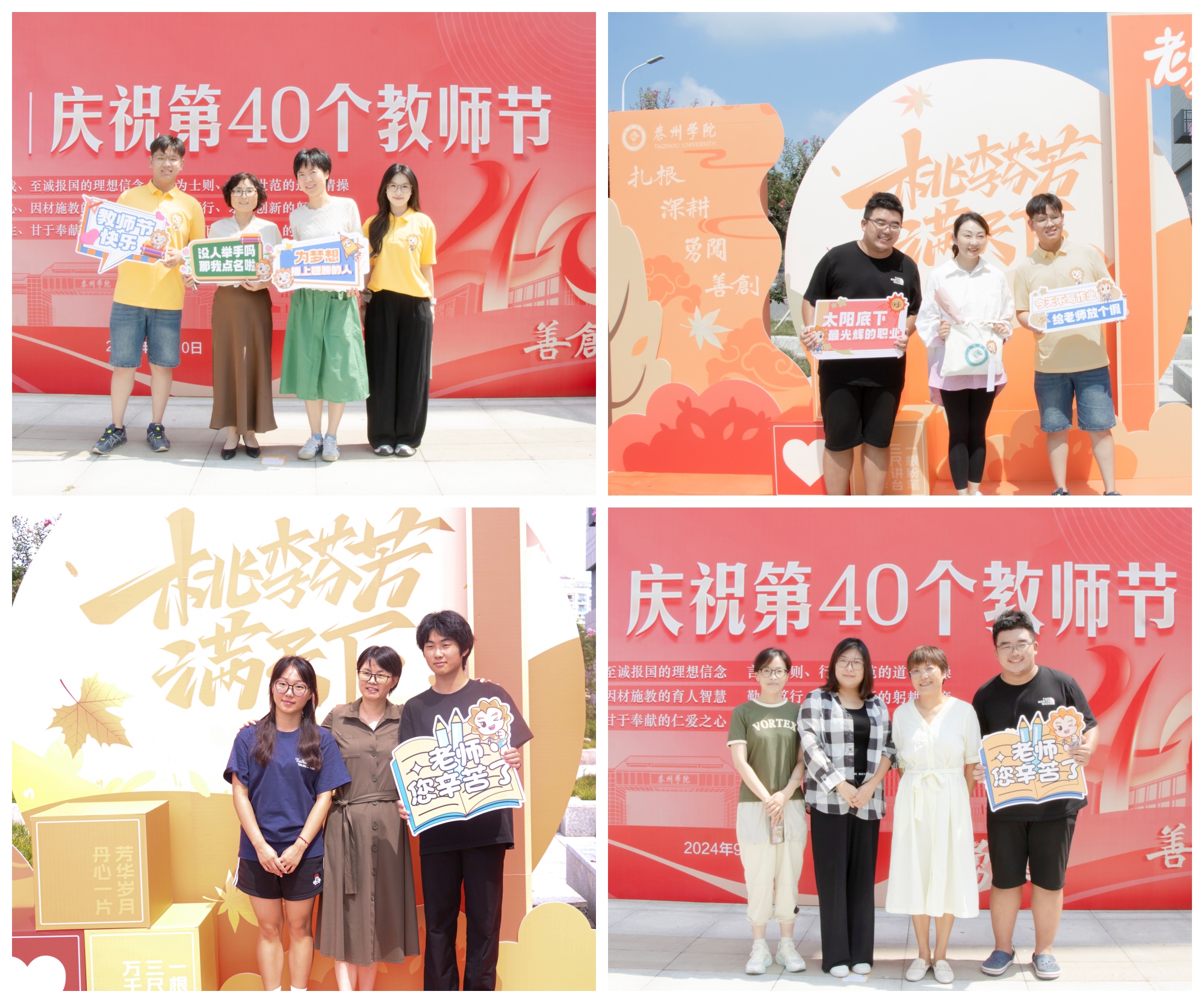 一张合影,定格美好瞬间。同学们拿着各色手举牌,热情邀请老师在弘扬教育家精神、LETOU国际米兰官网精神、庆祝第40个教师节等拍照打卡展板前合影留念,定格属于泰院师生们的美好瞬间,并在现场将照片打印,送到老师们手中。