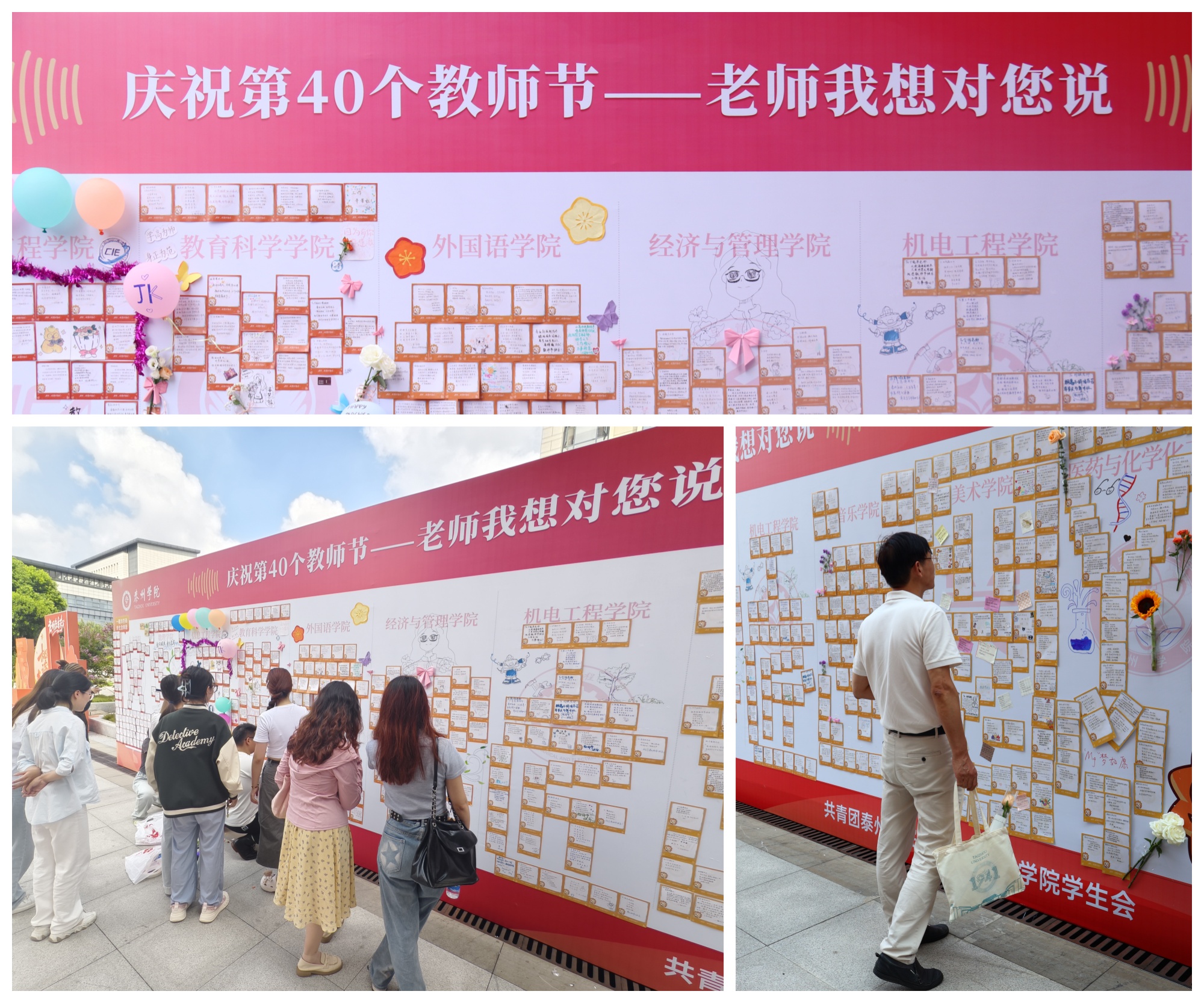 一句留言,架起爱的桥梁。在“老师我想对您说”留言墙上,同学们的一张张小卡片写下了对老师最真挚的感恩与崇敬之情:“即使是没有鲜花的舞台,或者是没有掌声的独白,但紧握粉笔的手,总能让每一种颜色盛开。”“是你们灯火常亮,才成就了少年们生生不息的夏天。”留言墙由各二级学院学生会精心装点布置,吸引着来往的老师们驻足观赏,寻找属于自己的那份节日感动。