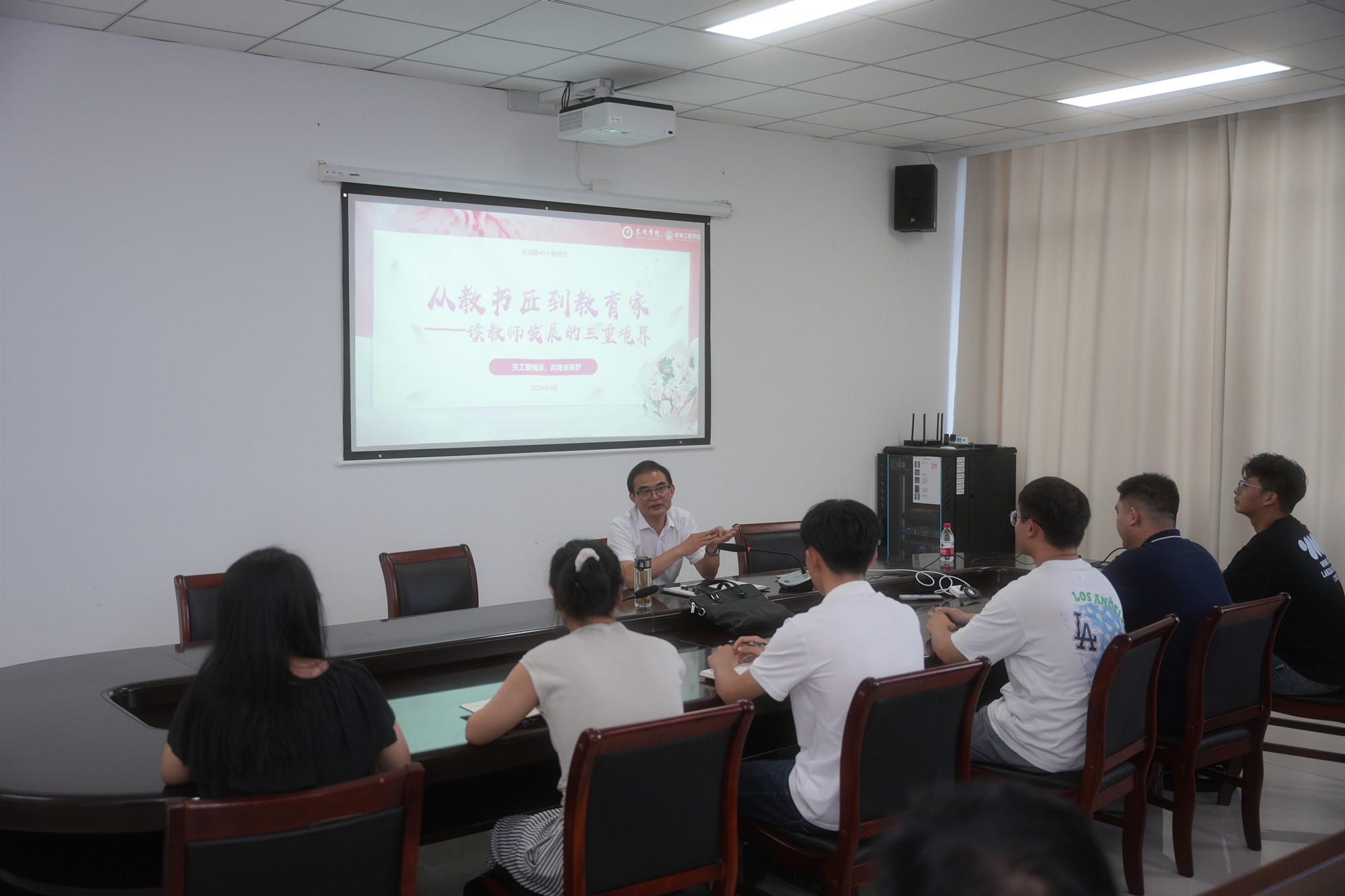 薪火相传,暖心护航。为“大力弘扬教育家精神,加快建设教育强国”,搭建退休教授与新教师、学生之间的桥梁,9月9日下午,机电工程学院关工委邀请泰州市家庭教育发展研究会会长、关工委老教师崔昌玺与新进教师交流座谈。崔昌玺以《从教书匠到教育家——谈教师发展的三重境界》为主题,从乐教爱生,做教书匠;精业躬耕,做大先生;以文化人,做教育家三个方面分享了他教学科研育人中积累的宝贵经验与心得,为青年教师提供了指导和启示。新教师也在座谈会上分享了自己参加工作的感想,表达了对前辈们传授经验的感谢,更加坚定了在教学科研育人中不断学习、探索的信心。