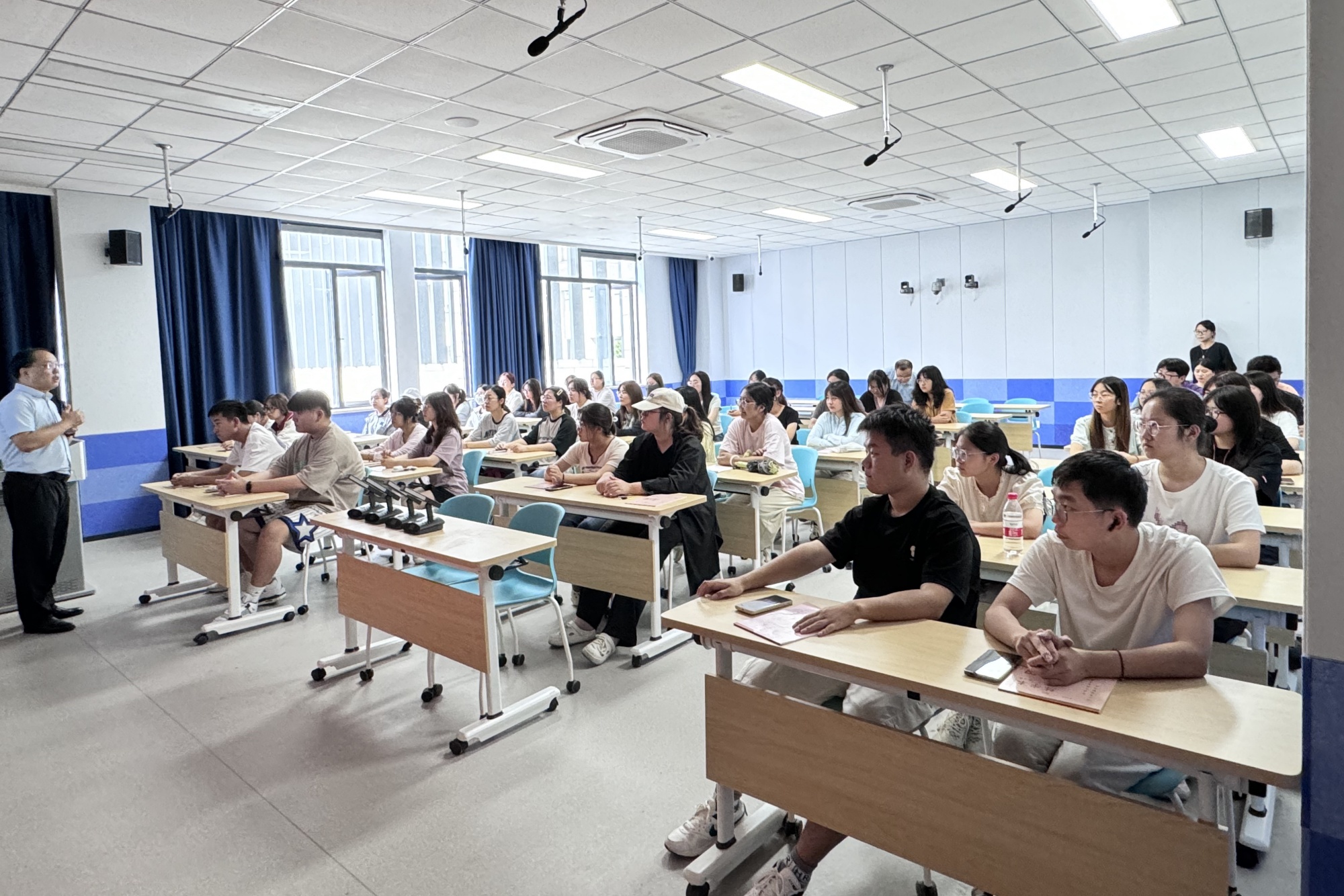 窦平老师现任泰州市海光中心小学党支部书记、校长,先后获批为江苏省特级教师、江苏省教育家型校长创新培育计划培养对象、省“333工程”高层次人才培养对象。讲座中,窦平老师分享了他的教育故事,围绕青年教师成长成才要求,从“思维、信念、读书、主张”等维度与定向师范生同学进行交流。