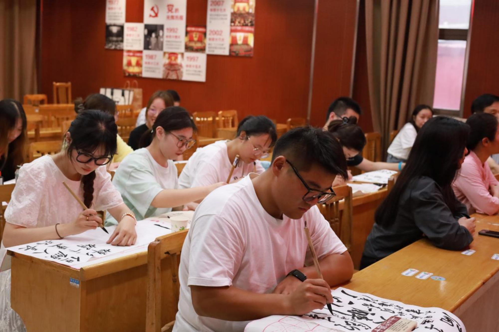 随后,师生代表们与社区老党员们围坐一堂,一边学习中国书法艺术,书写中秋佳句,一边倾听老党员们讲述老一辈艰苦奋斗、为党为国的故事。学生党员陈欣冉感慨道:“老党员全心全意为人民服务的精神深深激励着我要坚定信仰、努力奋斗,努力成为服务地方经济社会发展的优秀教育人才。”