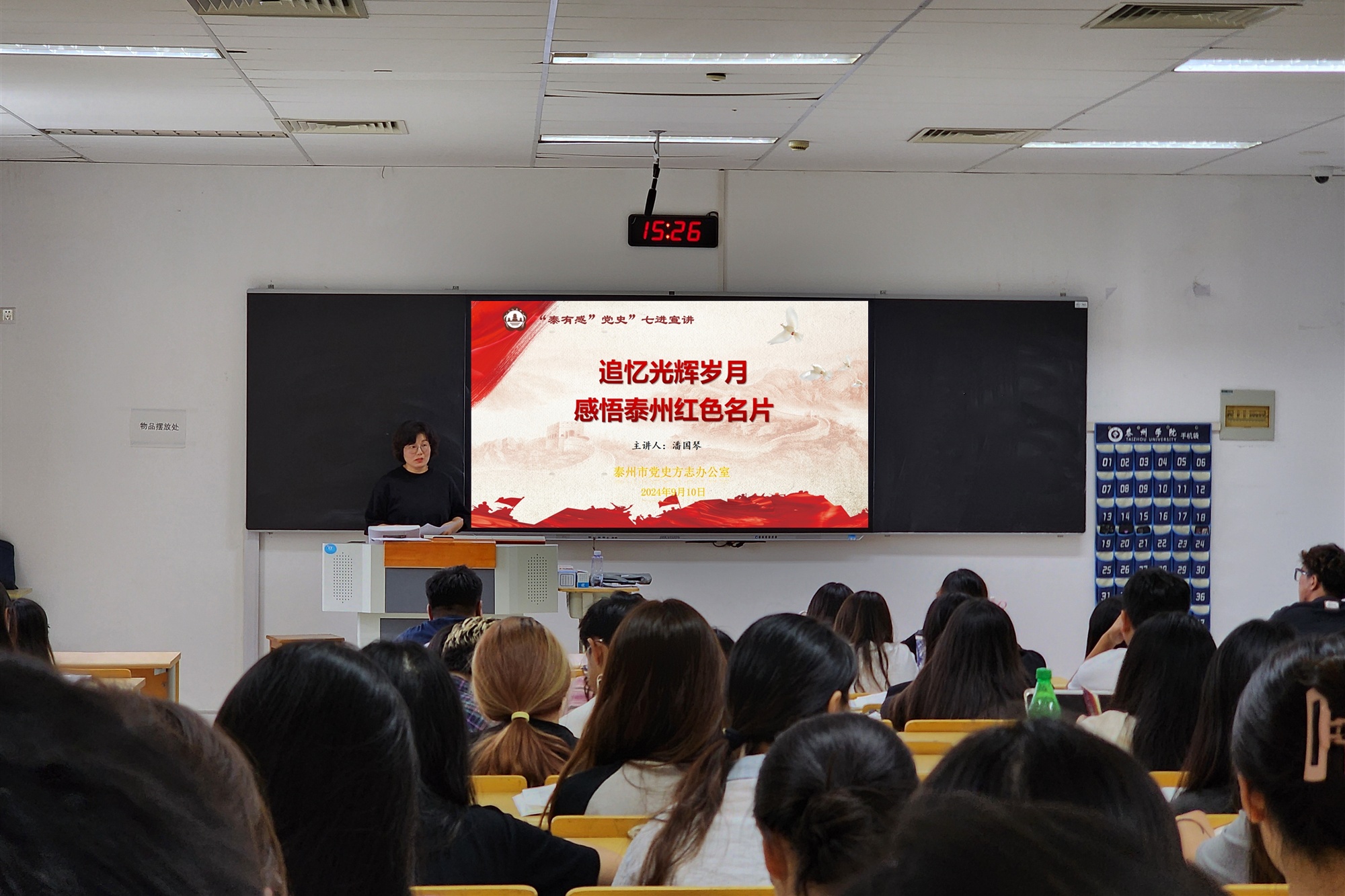 为深入学习贯彻习近平新时代中国特色社会主义思想和党的二十届三中全会精神,引导大学生知史爱党、知史爱国,增强历史感和责任感,9月10日下午,泰州市党史方志办带着“‘泰有感’党史”走进“习近平新时代中国特色社会主义思想概论”教学现场,为2022级音乐学师范1班、2班的100多名学生们讲授了一堂生动的思政课。