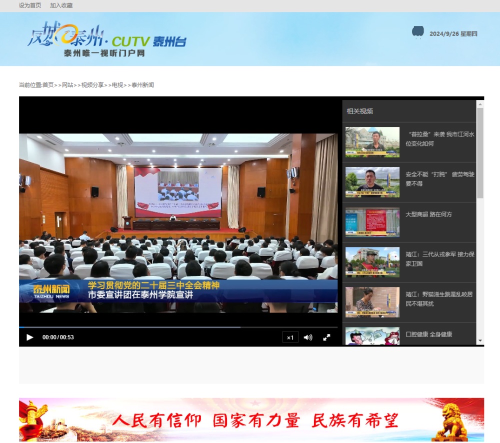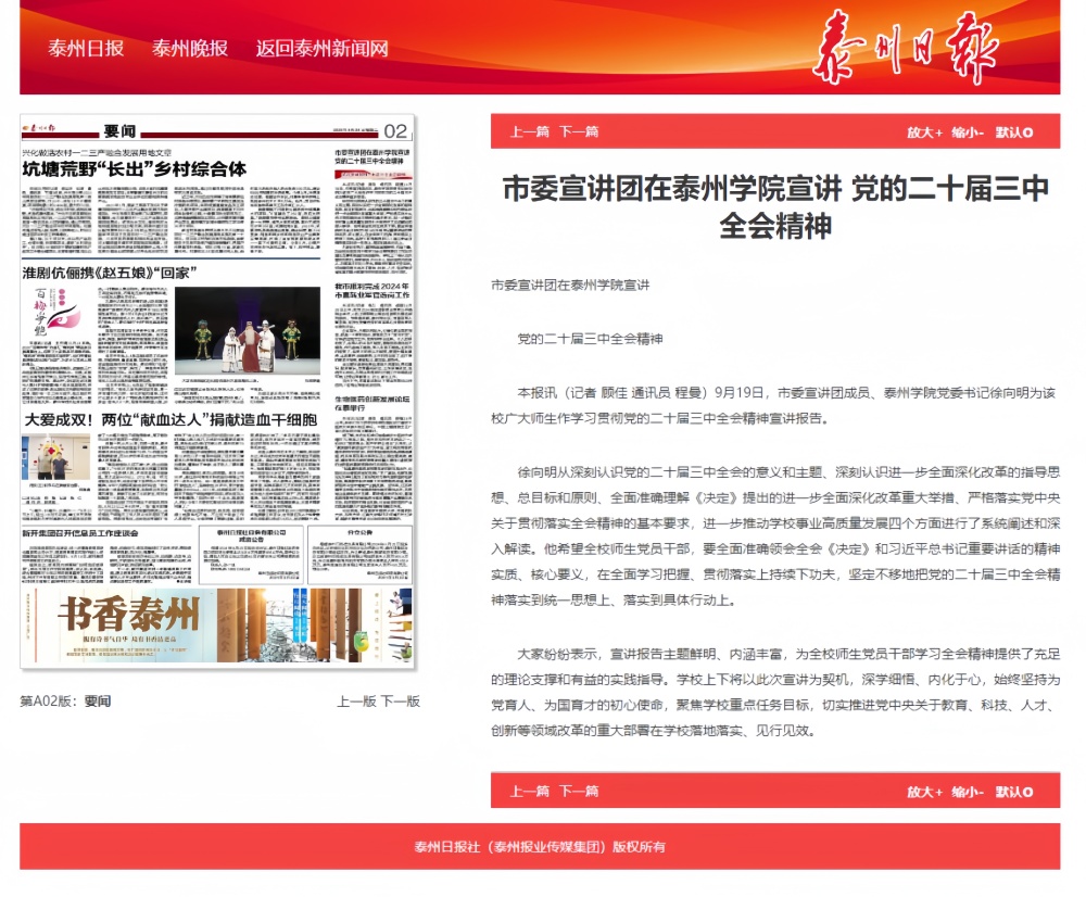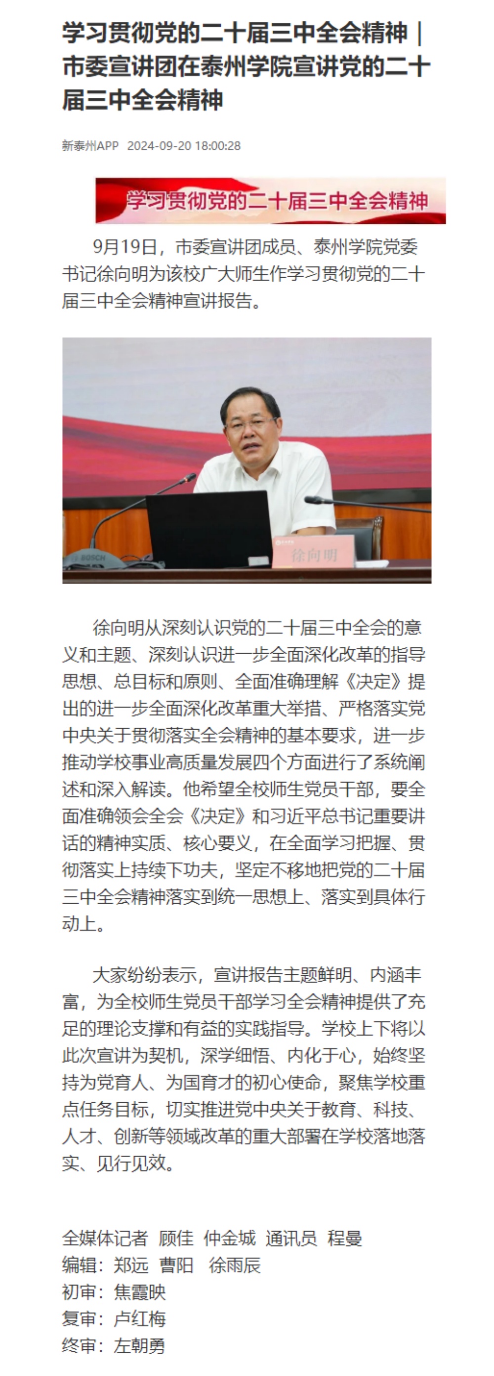 《泰州广播电视台》《新泰州》《泰州日报》2024年9月20日、24日分别报道市委宣讲团在米兰官网宣讲党的二十届三中全会精神