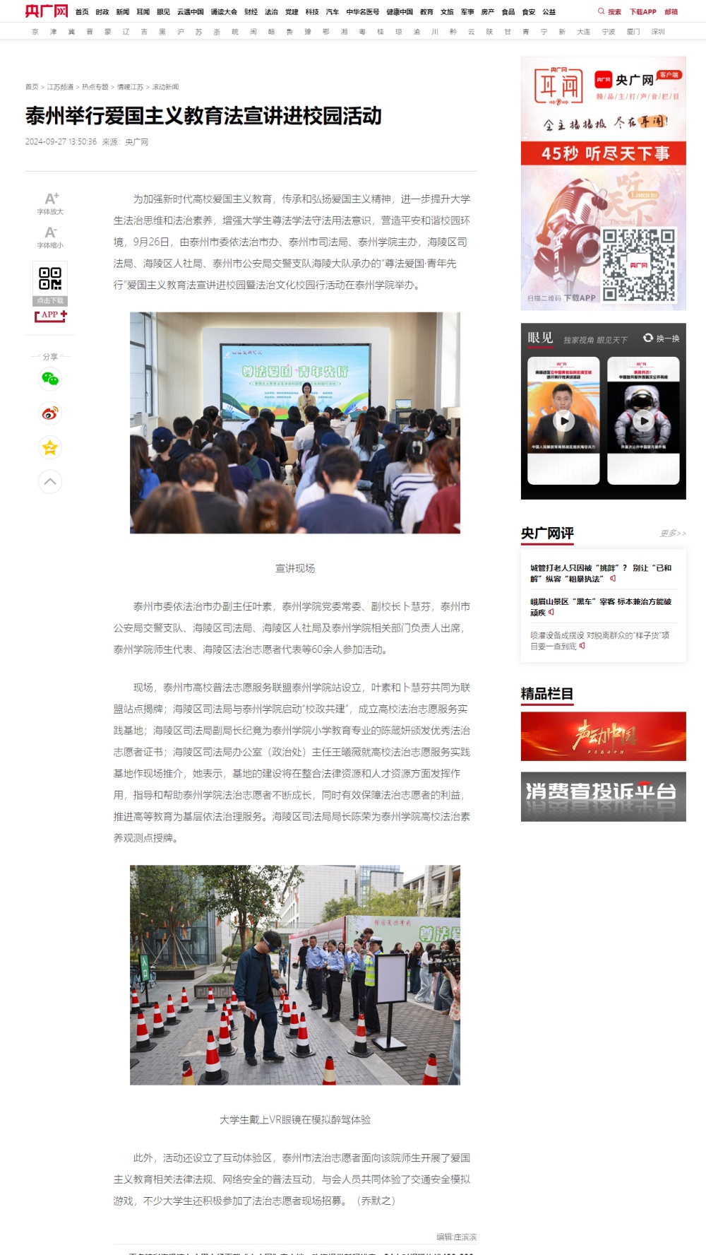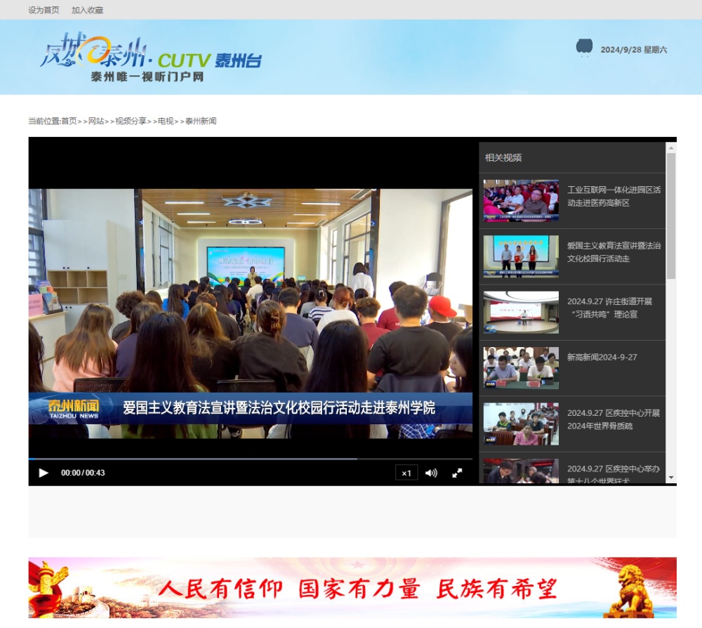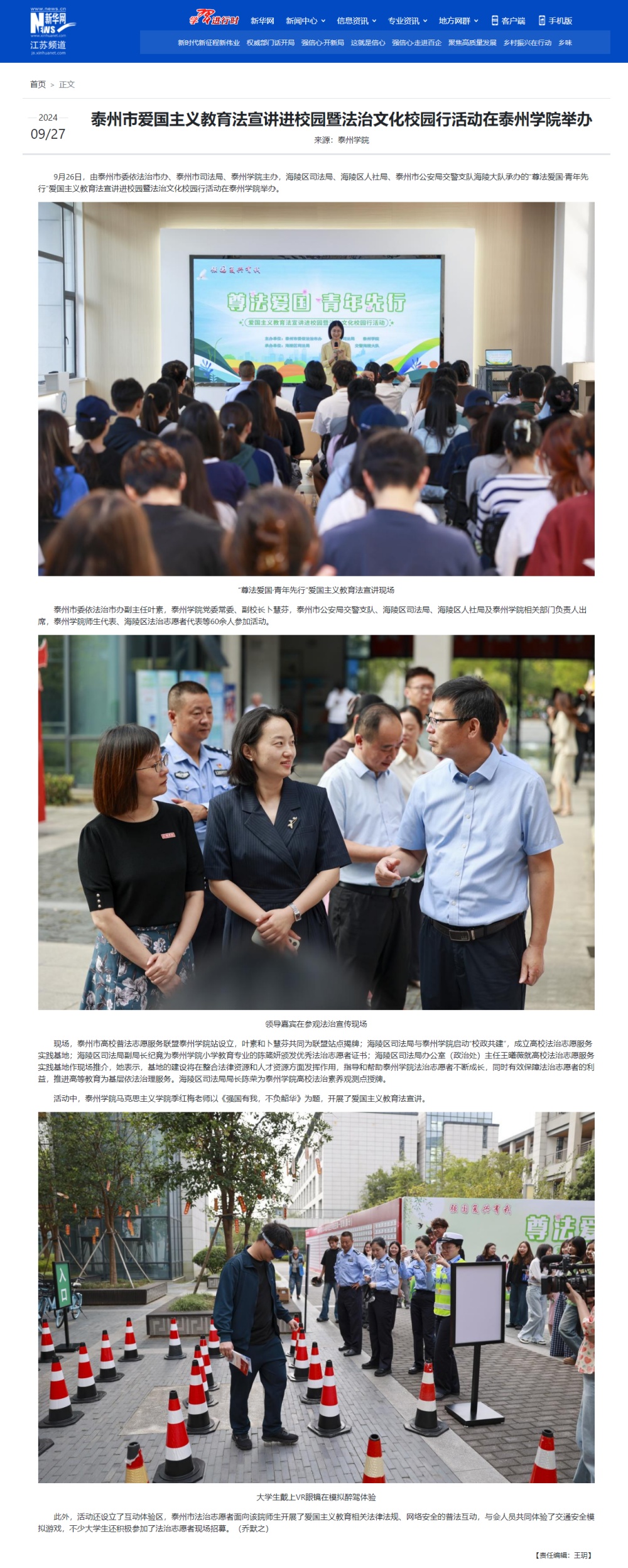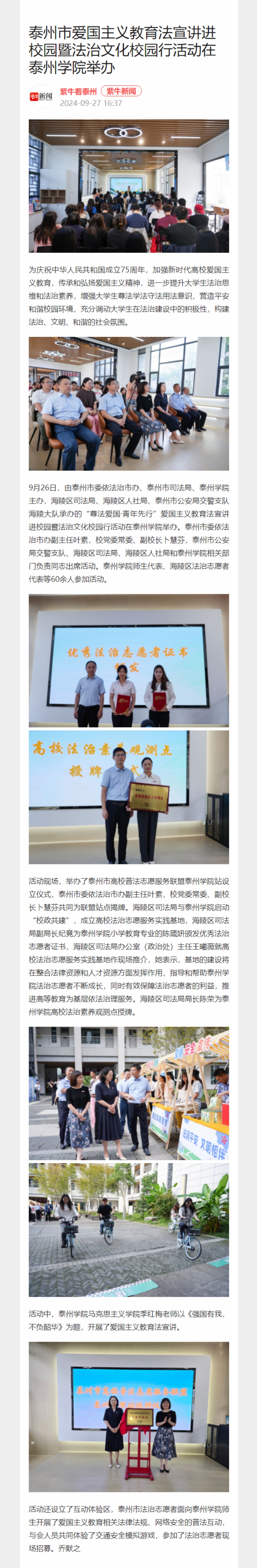 《新华网》《央广网》《紫牛新闻》《泰州广播电视台》2024年9月27日报道泰州市爱国主义教育法宣讲暨法治文化校园行活动走进米兰官网