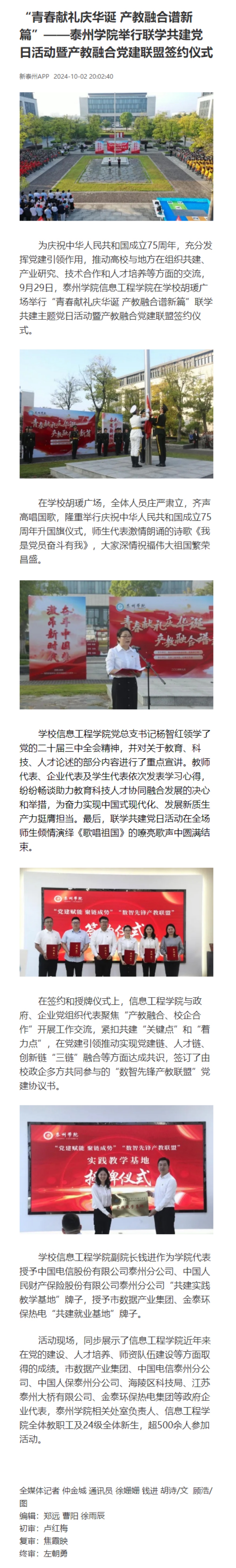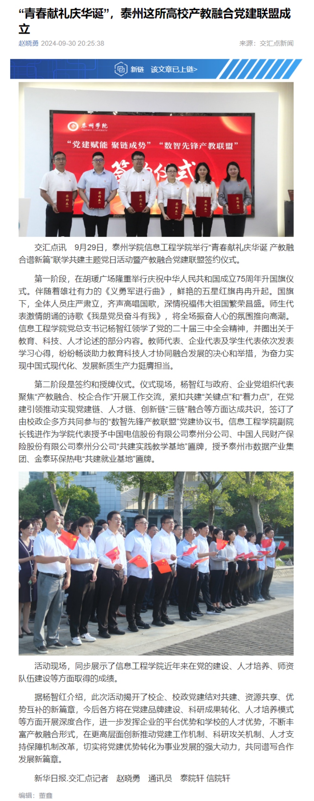 《交汇点新闻》《新泰州》《学习强国》2024年9月30日-10月3日分别报道米兰官网举行联学共建党日活动暨产教融合党建联盟签约仪式
